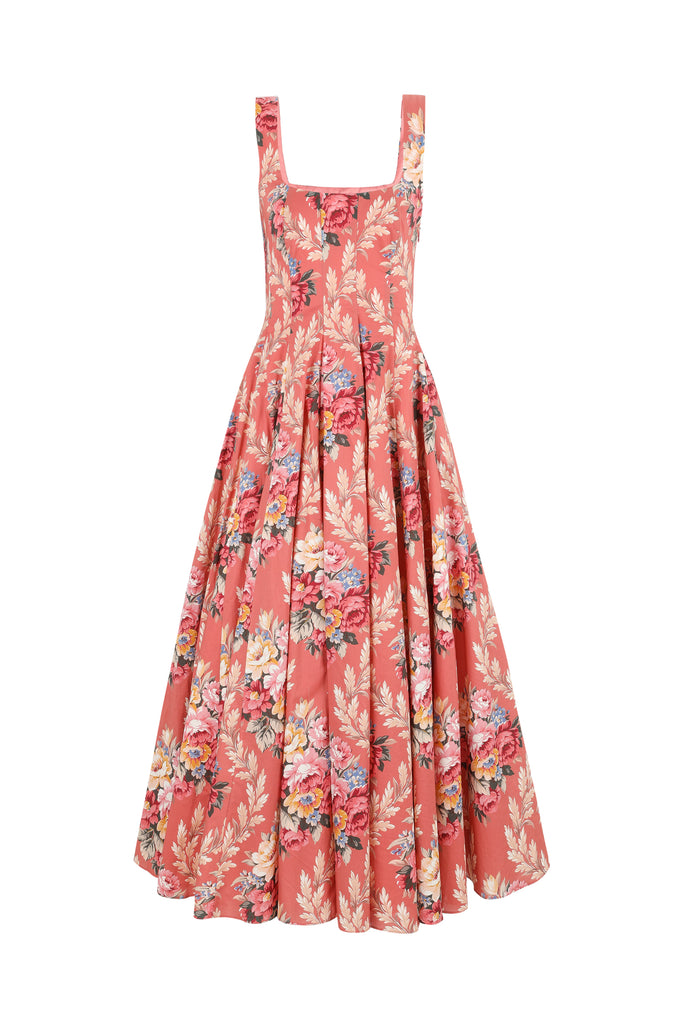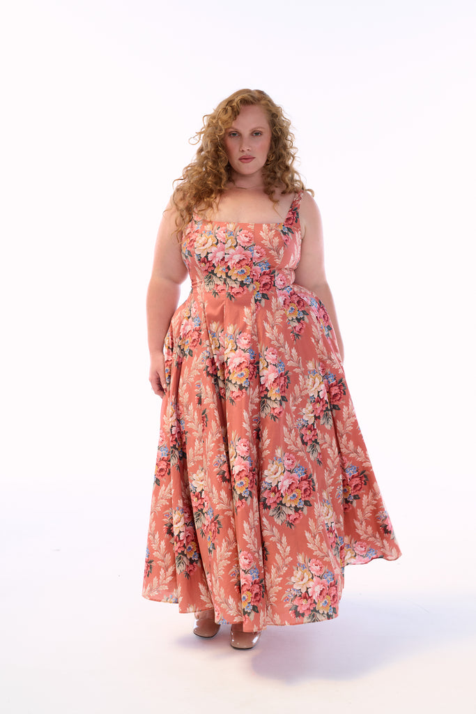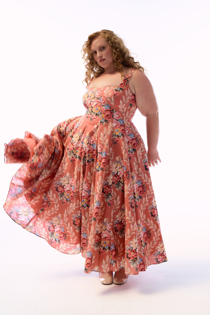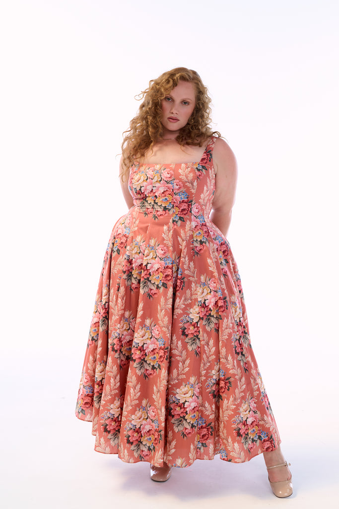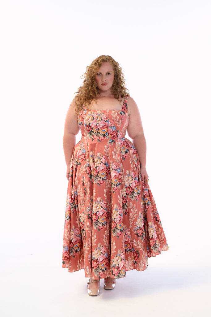 Adorned with an autumnal floral in rich seasonal colors that evoke the beauty of changing leaves, this sleeveless paper cotton midi dress features corset back lacing with a modesty panel, hidden pockets, and curve-skimming princess seams to shape a soft, feminine silhouette.