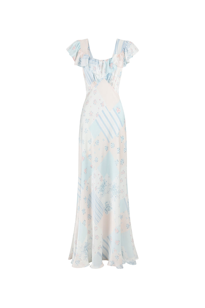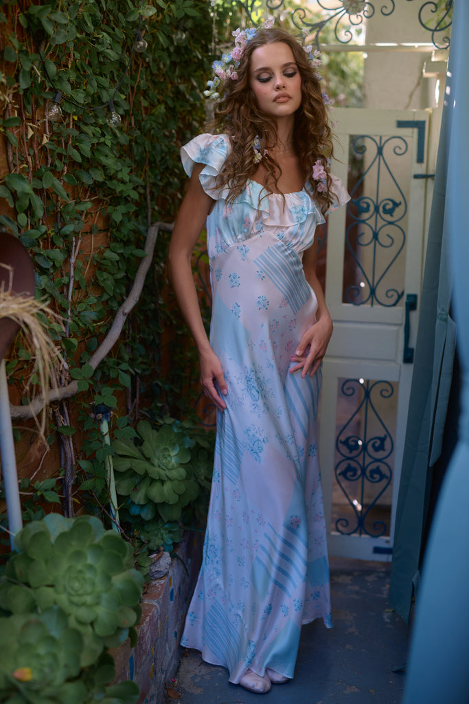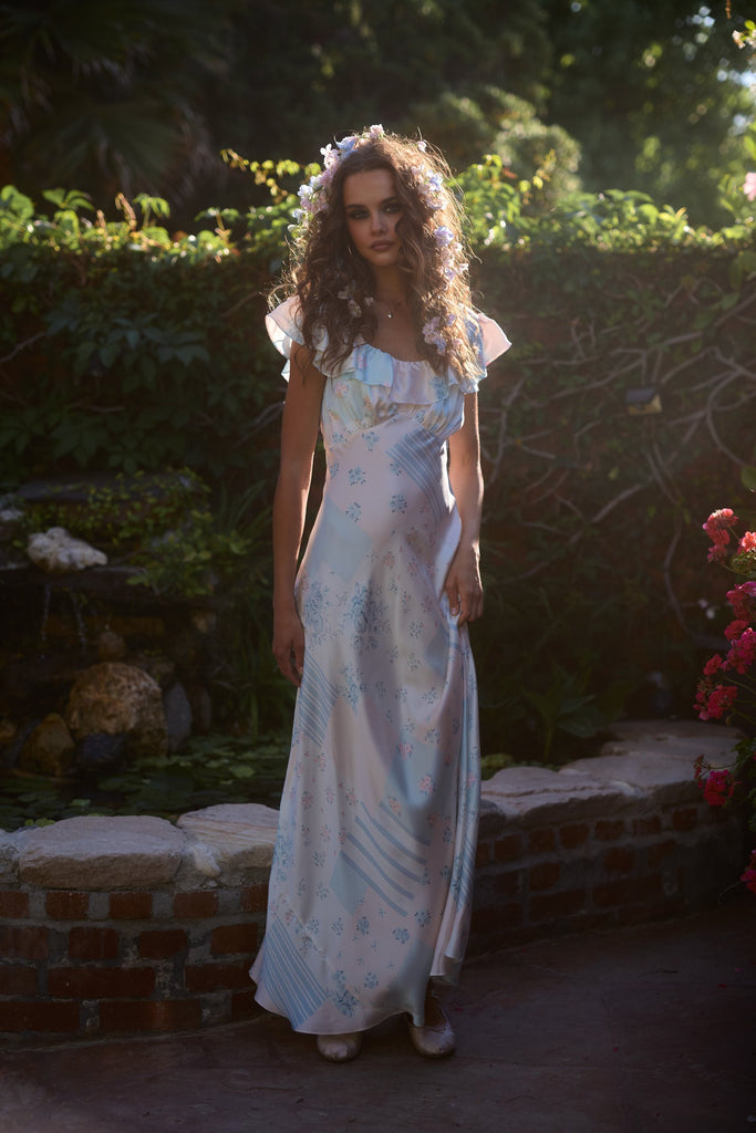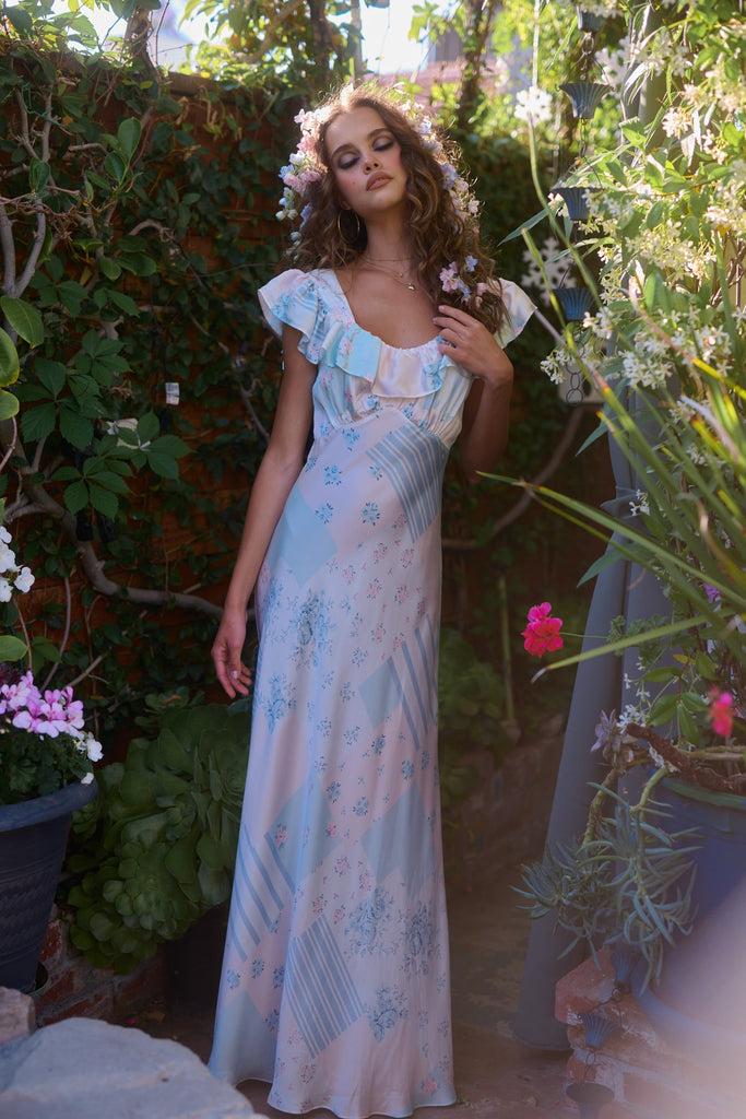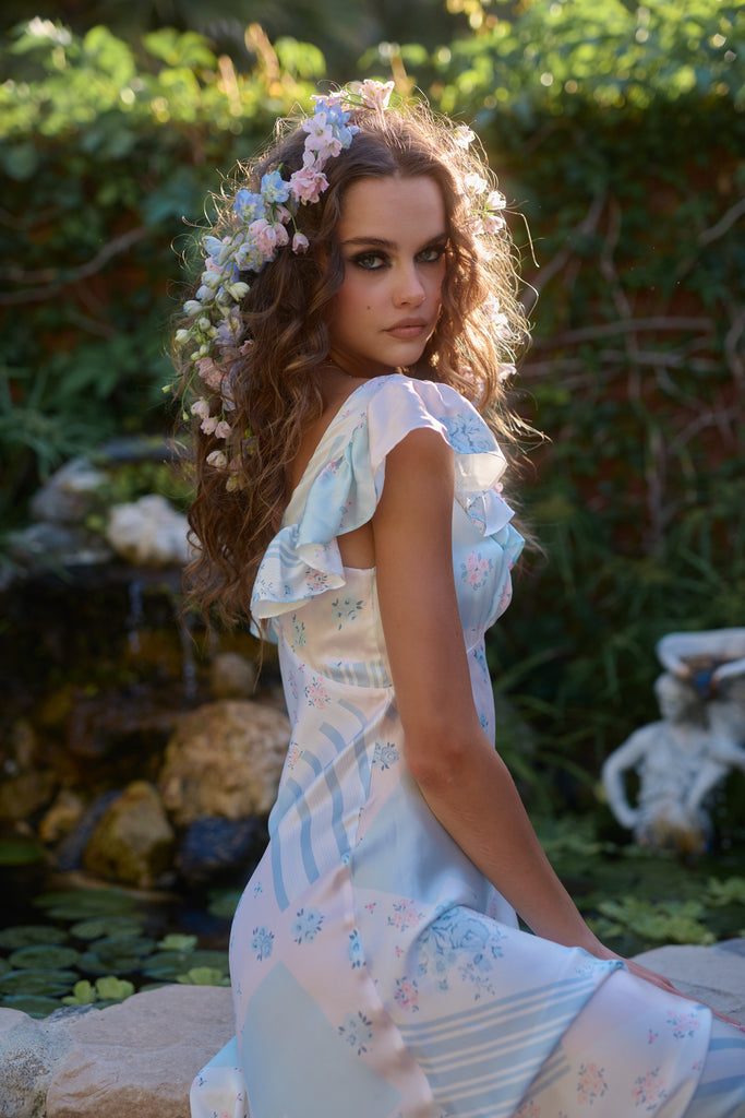 Embrace the girl-next-door suburban aesthetic in this silk charmeuse bias cut slip dress. Featuring The Babysitter print's nostalgic 80s and 90s patchwork pastels, sourced from Selkie founder Kimberley Gordon’s dedicated vintage market hunts, pleated ruffles dance across the front and sleeves while tiny pleats and double lining at the bust ensure a flawless fit. "Whenever I wear pastels," Gordon says, "I feel like a different person, I feel softer."