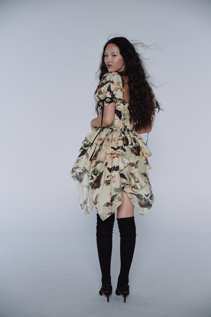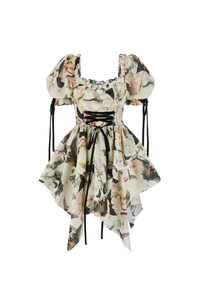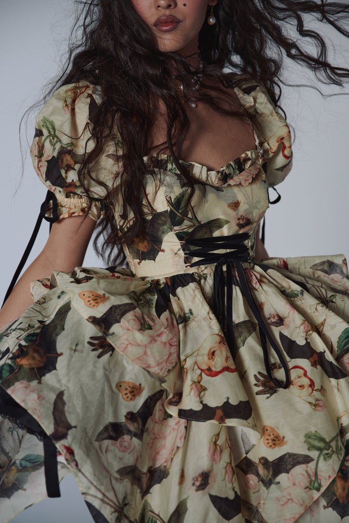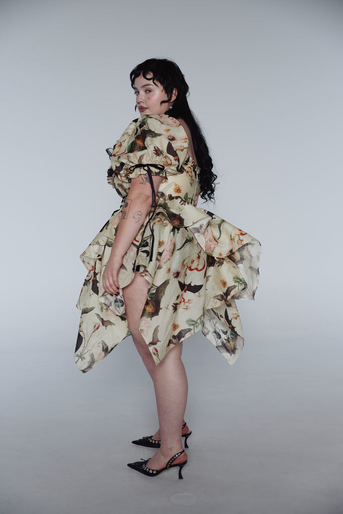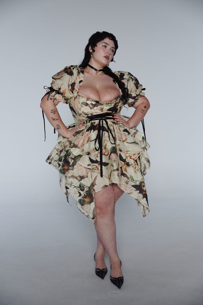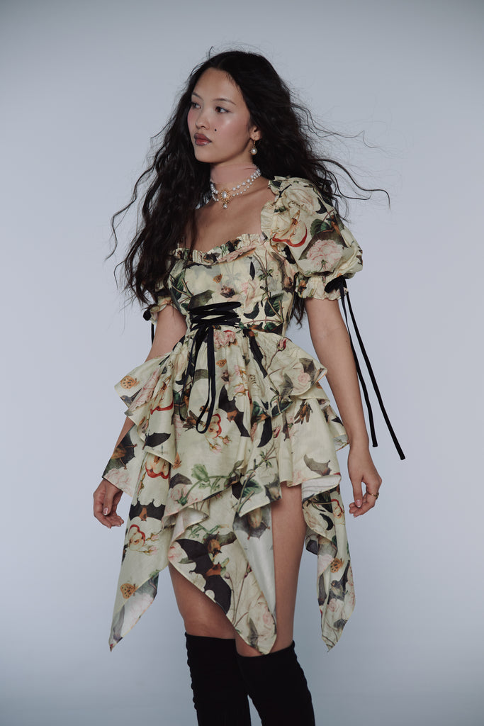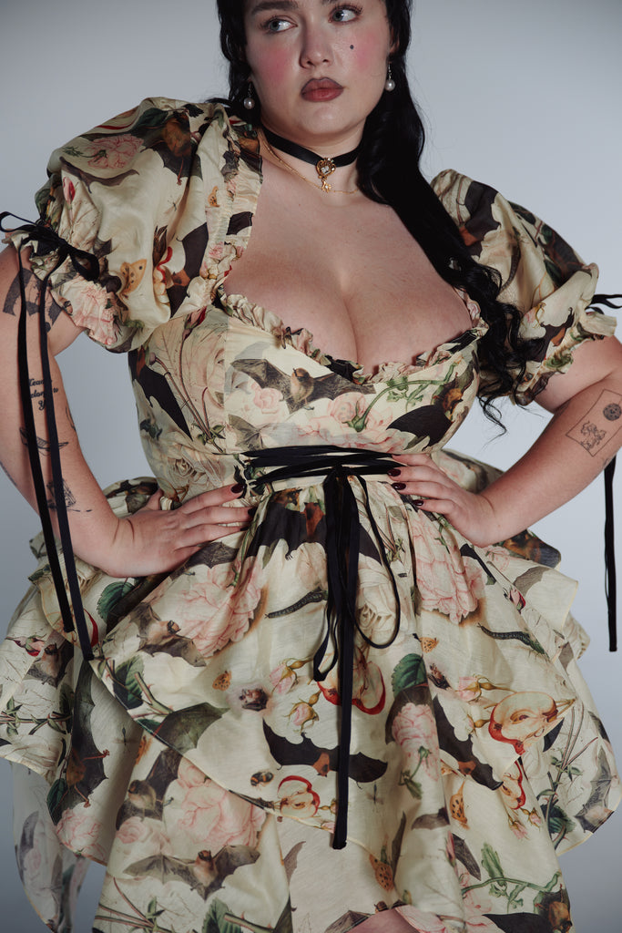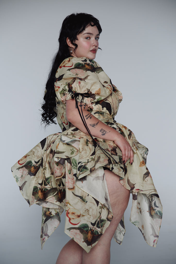A composite print of antique botanical illustrations from the 16th century graces this playful dress featuring a late 90s handkerchief skirt and functional corset that ties with a velvet ribbon. Puff sleeves adorned with matching velvet bows lend this piece a delightful excess of femininity.
