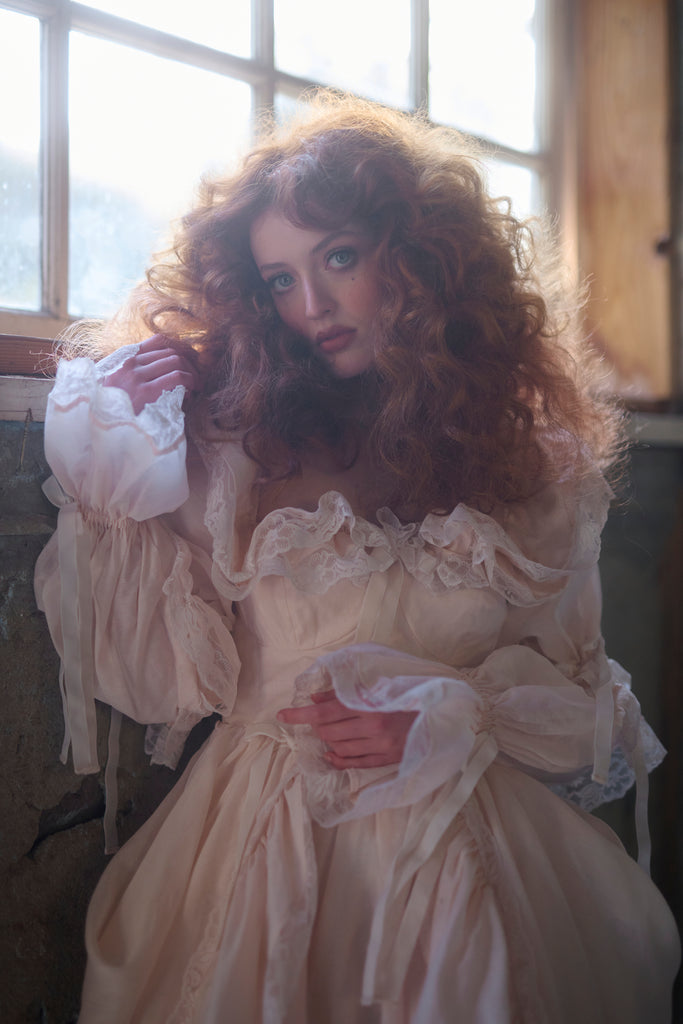 Evocative of an angelic 1960s ceremonial gown, this resplendent blush confection radiates the unbridled joy and light of coming-of-age. Layers of billowing organdy drift like clouds over the pure silhouette, while the long sleeves, adorned with ties and lace trim, mirror the cinched details of the skirt. The off-the-shoulder neckline strikes a perfect balance, accentuated by charming bows at the bust, waistline, and sleeves. You won’t sacrifice style for comfort—this gown is fully lined with 100% cotton.