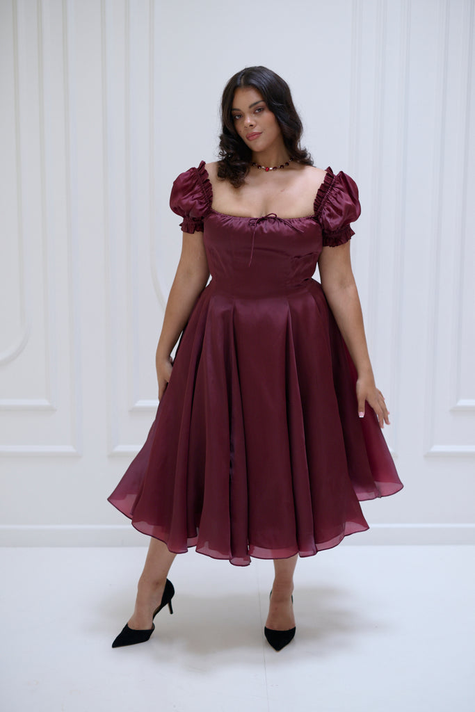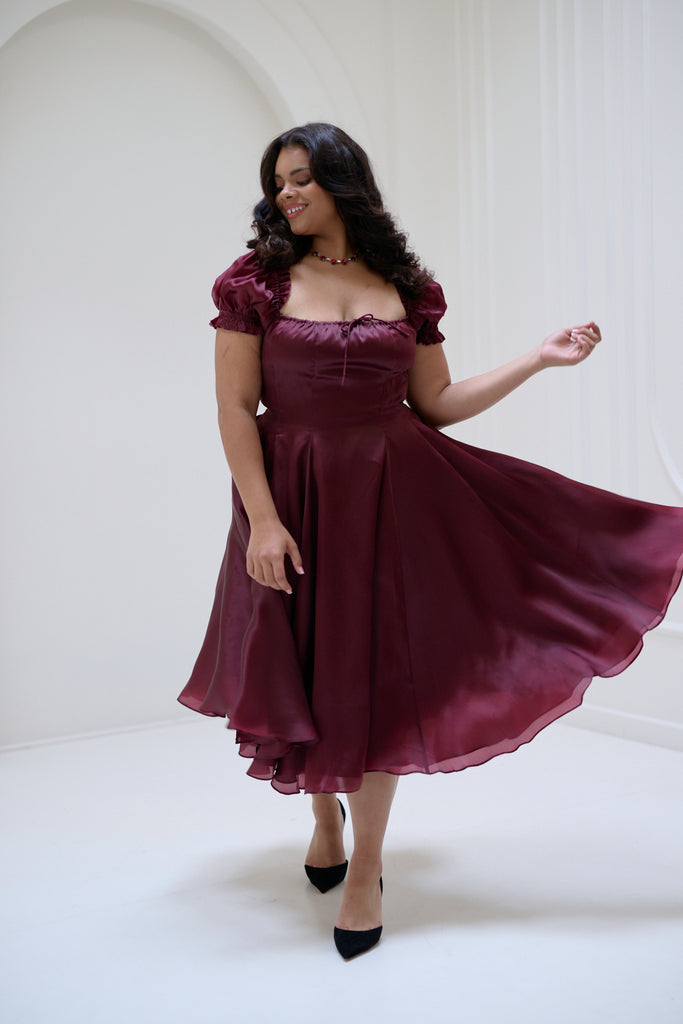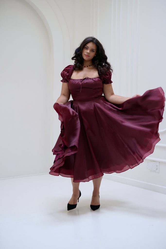 Smooth the skirts of the Bordeaux Garden Party dress as you slip through the secret bookcase door of a hidden speakeasy, nestle into a plush overstuffed settee and toast to your friends with glittering champagne cocktails. We achieve the perfect fit with full princess seams that hug your body in all the right places. Yards and yards of heavenly crisp silk, layered and finished with a buttery soft, rayon petticoat. With this dress we introduce a smaller, puffy cap sleeve style perfect for all your spinning needs with our classic circular skirt.