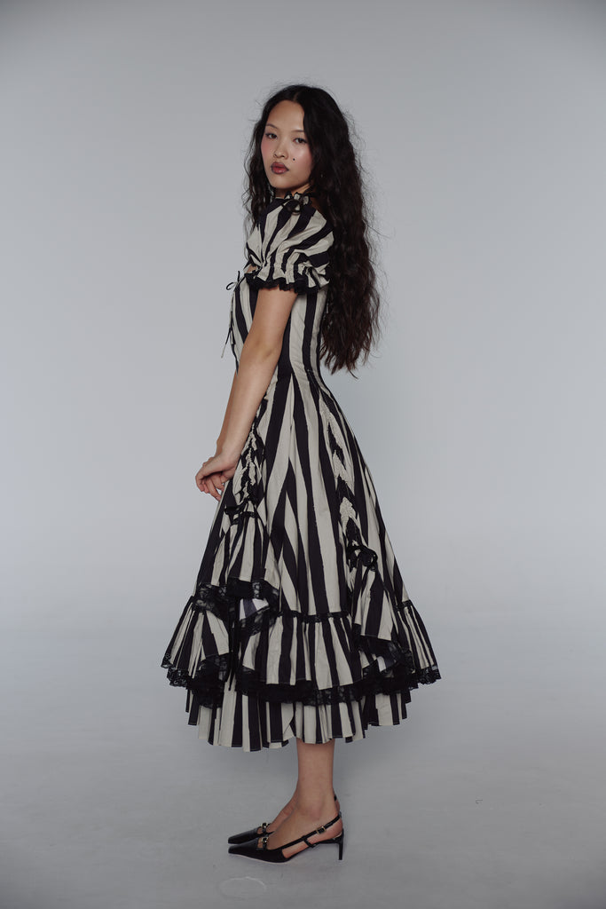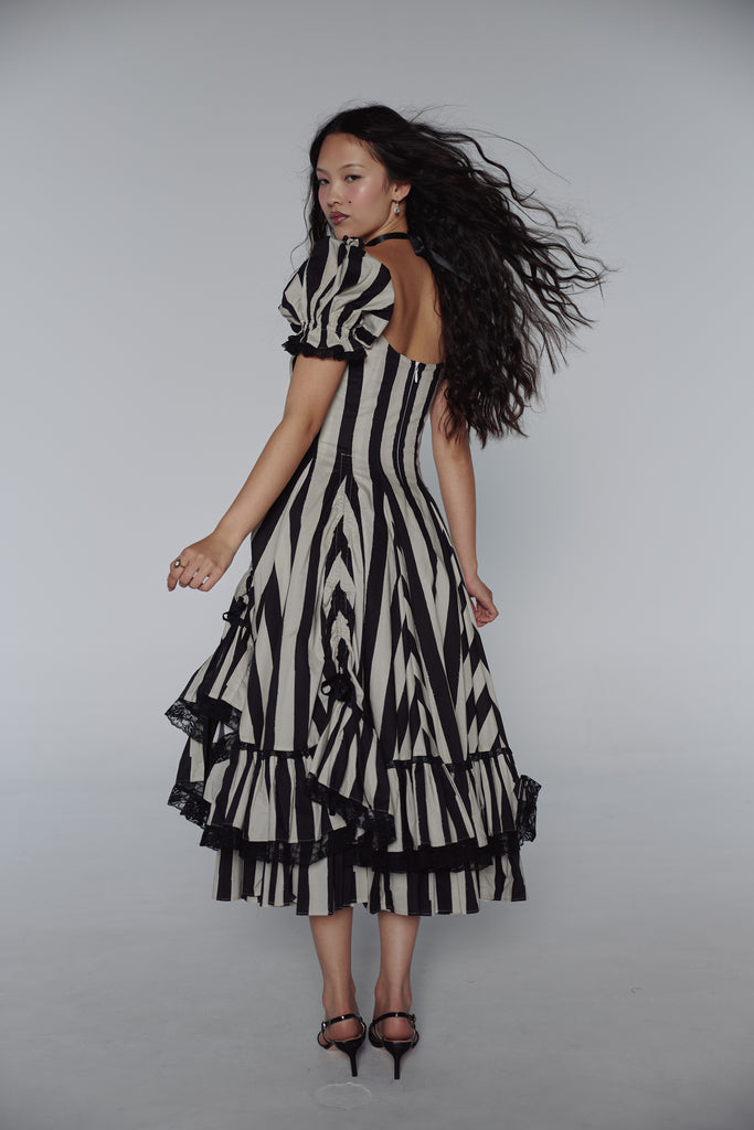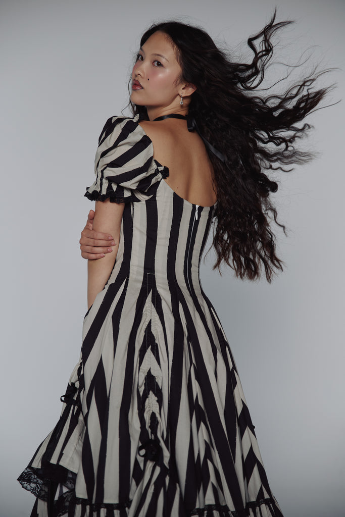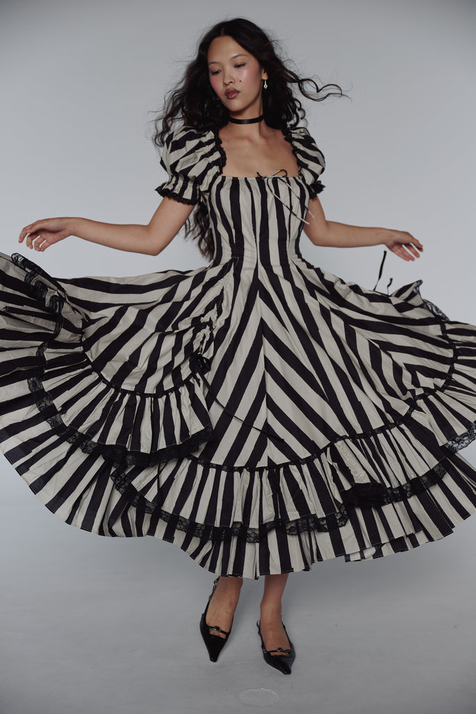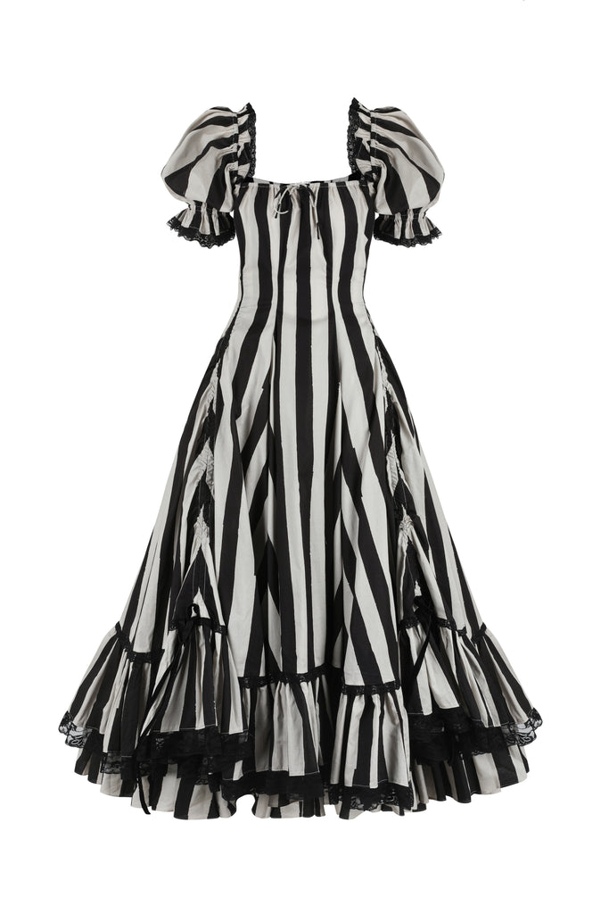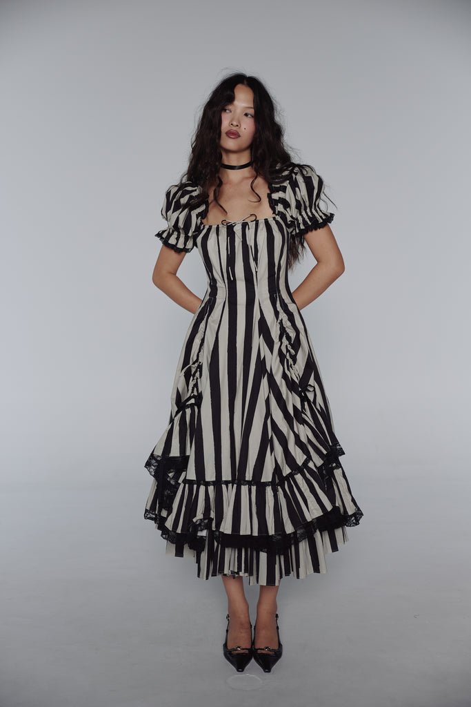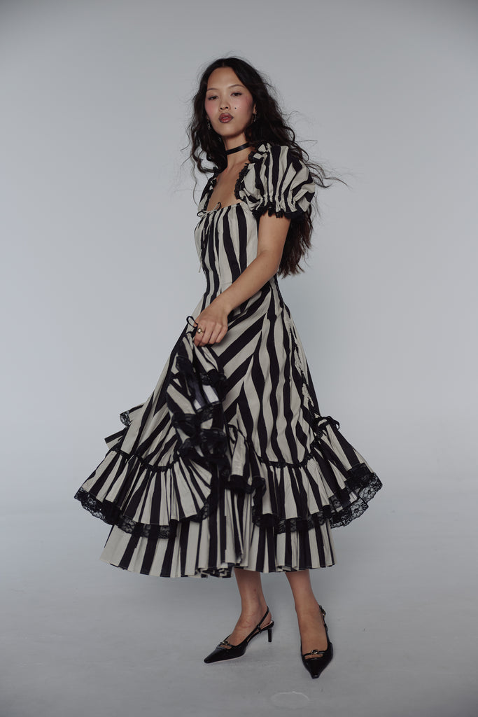 Drawing from the atmospheric beauty of Sleepy Hollow and inspired by the striped gown worn by Virginia Saint George in the 90s TV miniseries "The Buccaneers," this paper cotton midi dress features curve-hugging princess seams and romantic puff sleeves. A tie at the bust allows for adjustable fit while functional princess drawstrings and delicate lace details throughout complete the enchanting silhouette.