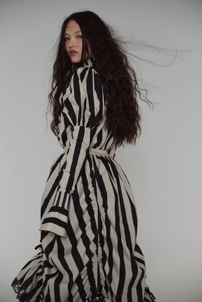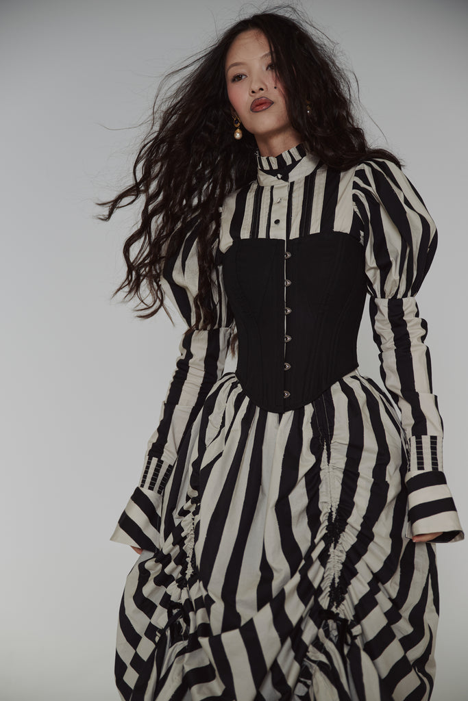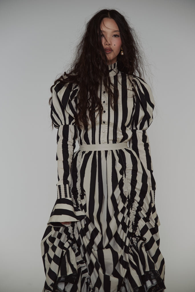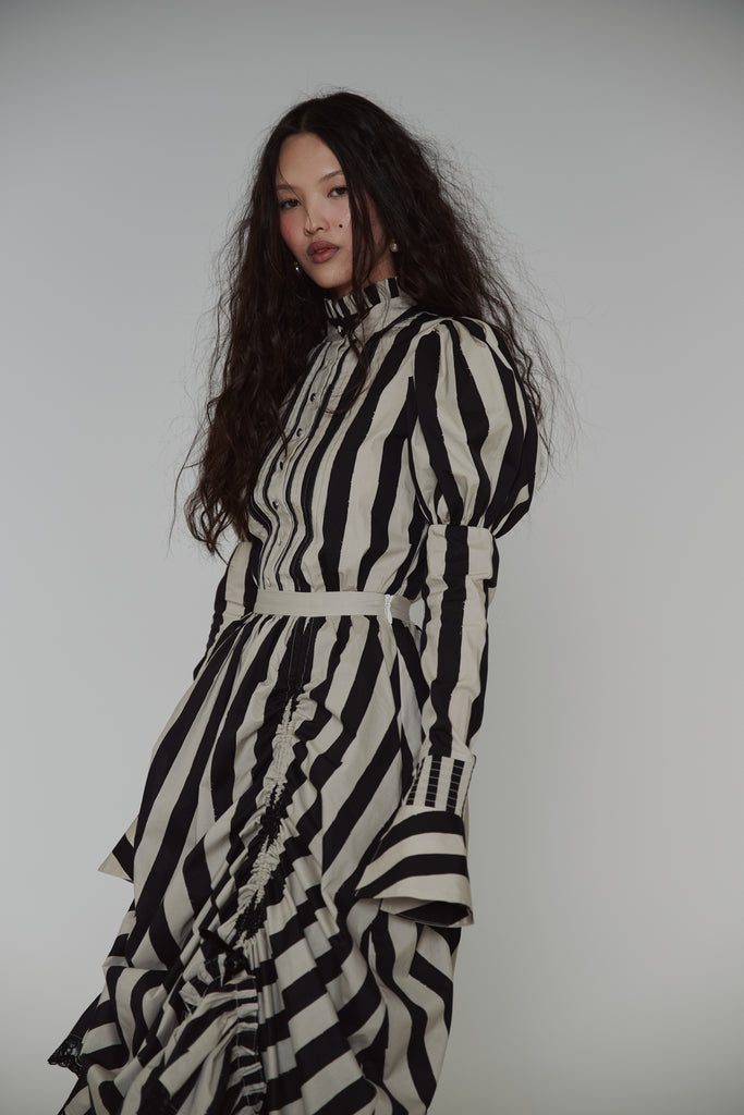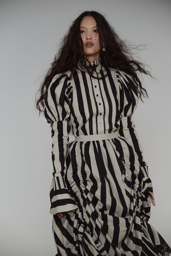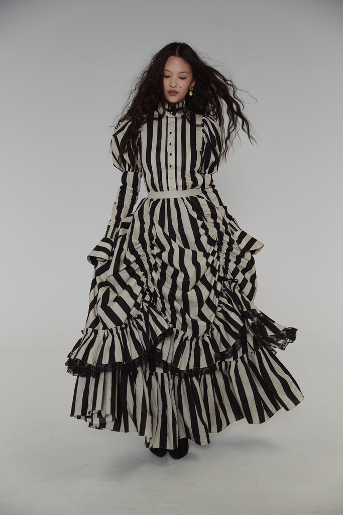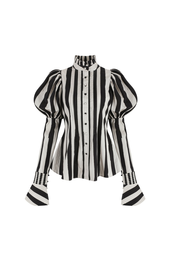 Drawing from the atmospheric beauty of Sleepy Hollow and inspired by the striped gown worn by Virginia Saint George in the 90s TV miniseries "The Buccaneers," this cotton poplin blouse features a ruffle collar and Selkie’s signature mutton sleeves with fitted arms and flared, buttoned cuffs. Pintuck details accent the front, while the fit-and-flare silhouette evokes an hourglass shape.