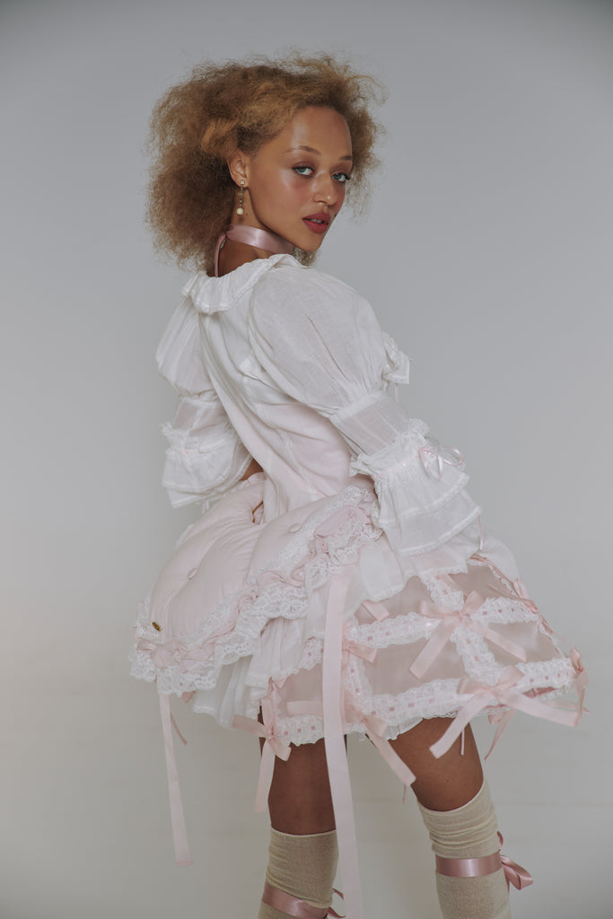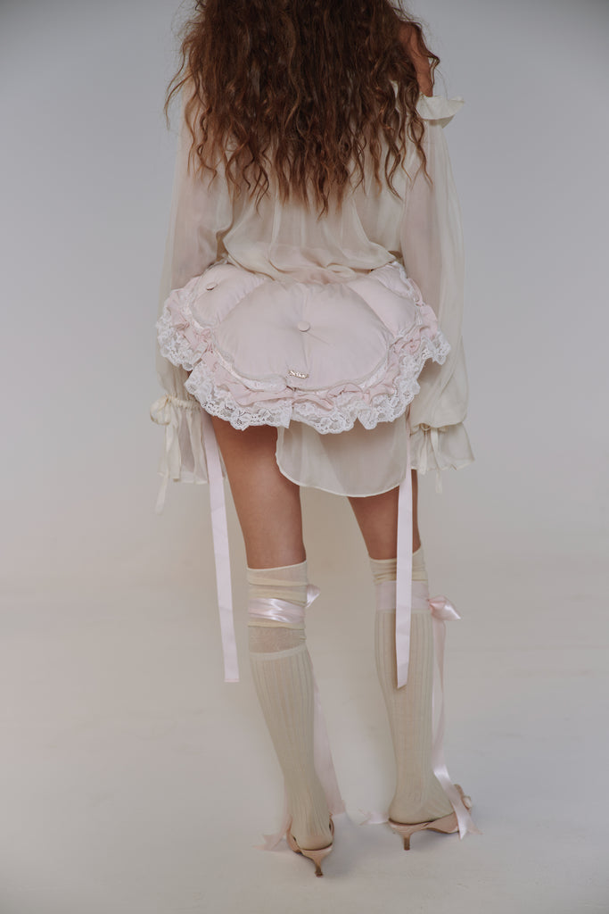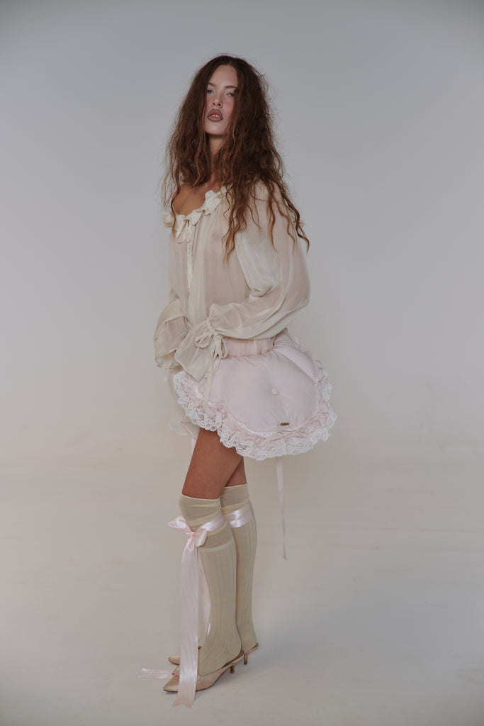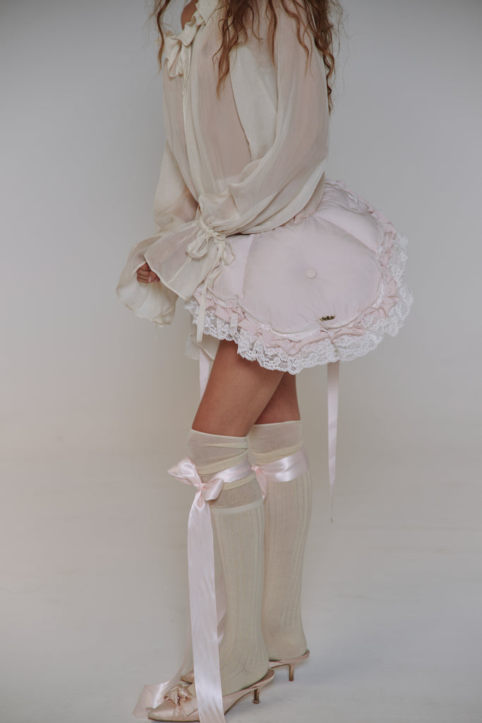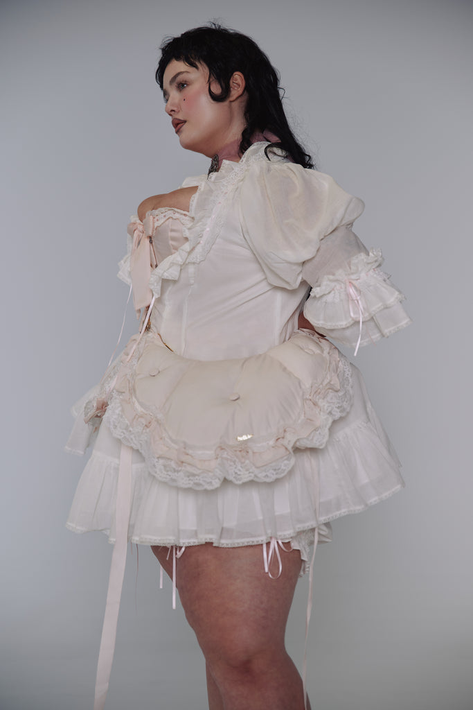 This quilted crossbody reimagines the 18th-century bum roll—once used to create elegant puffs beneath skirts—as a charming convertible accessory. Adjustable straps, delicate satin ribbon detail, and romantic ruffle with lace trim allow it to transform from crossbody to fanny pack with ease. The zipper closure and gold Selkie logo hardware complete this multifunctional piece that brings centuries-old shape wear to contemporary styling.