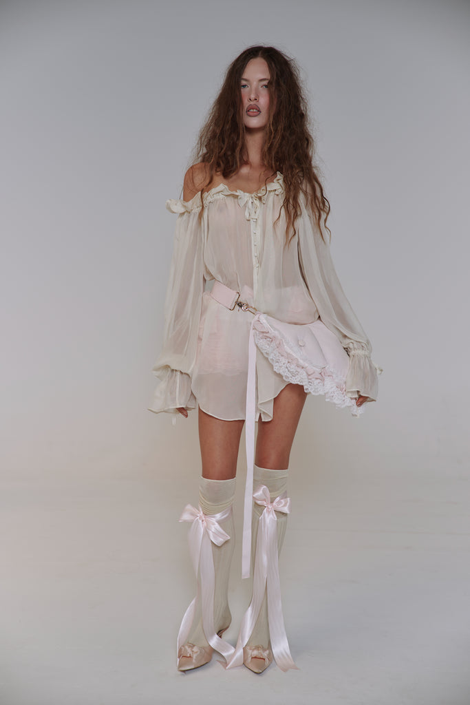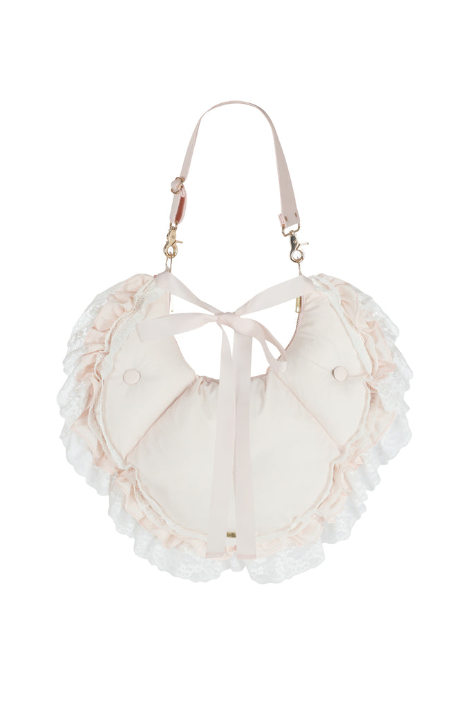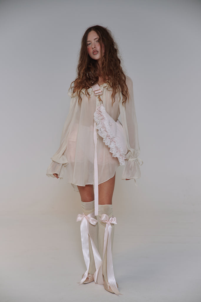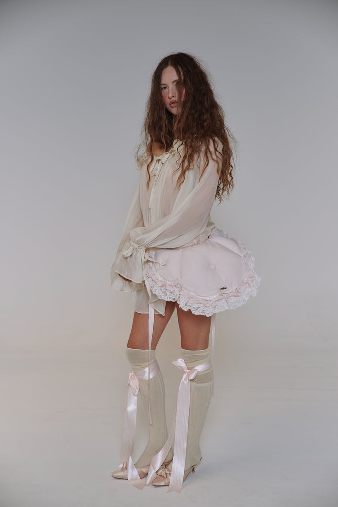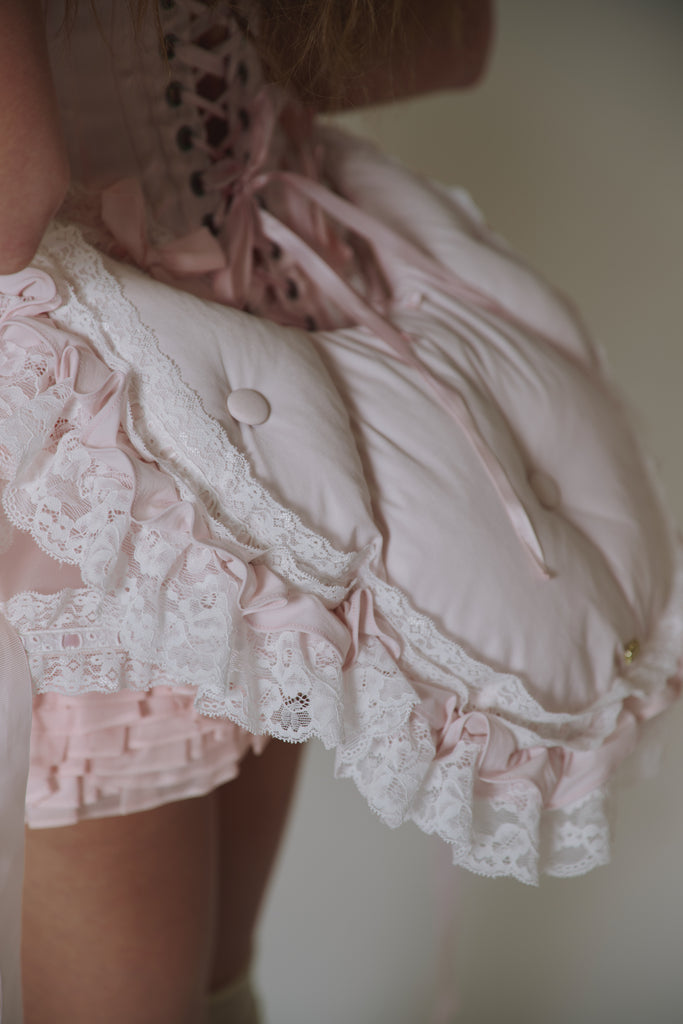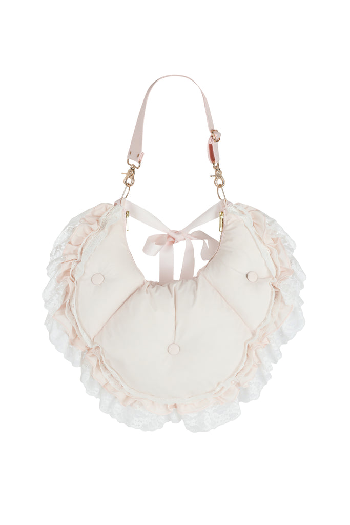 This quilted crossbody reimagines the 18th-century bum roll—once used to create elegant puffs beneath skirts—as a charming convertible accessory. Adjustable straps, delicate satin ribbon detail, and romantic ruffle with lace trim allow it to transform from crossbody to fanny pack with ease. The zipper closure and gold Selkie logo hardware complete this multifunctional piece that brings centuries-old shape wear to contemporary styling.