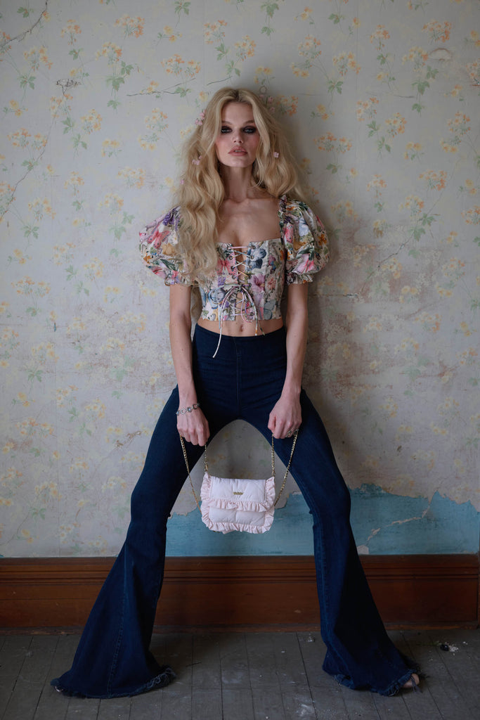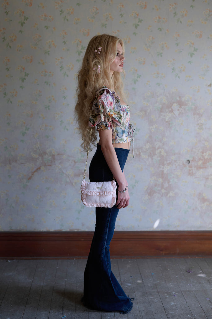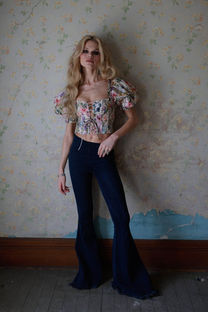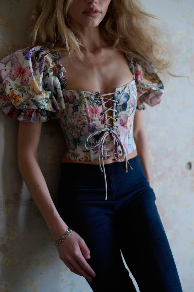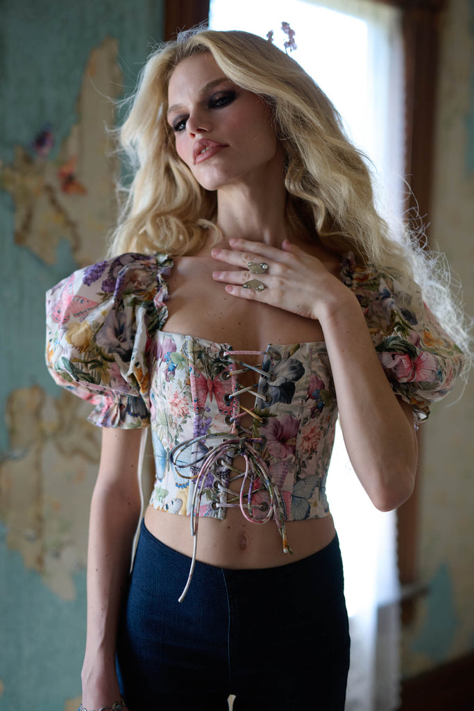 To poets and spiritualists, the butterfly is a symbol of the soul's journey, a reminder that even in the darkest of cocoons, the potential for transformation and transcendence lies within. Be reminded of your capacity for evolution with this homage to butterflies: a fully boned cotton corset with puff sleeves. Enlist its two draw cords to customize the cinching effect to your desired fit.