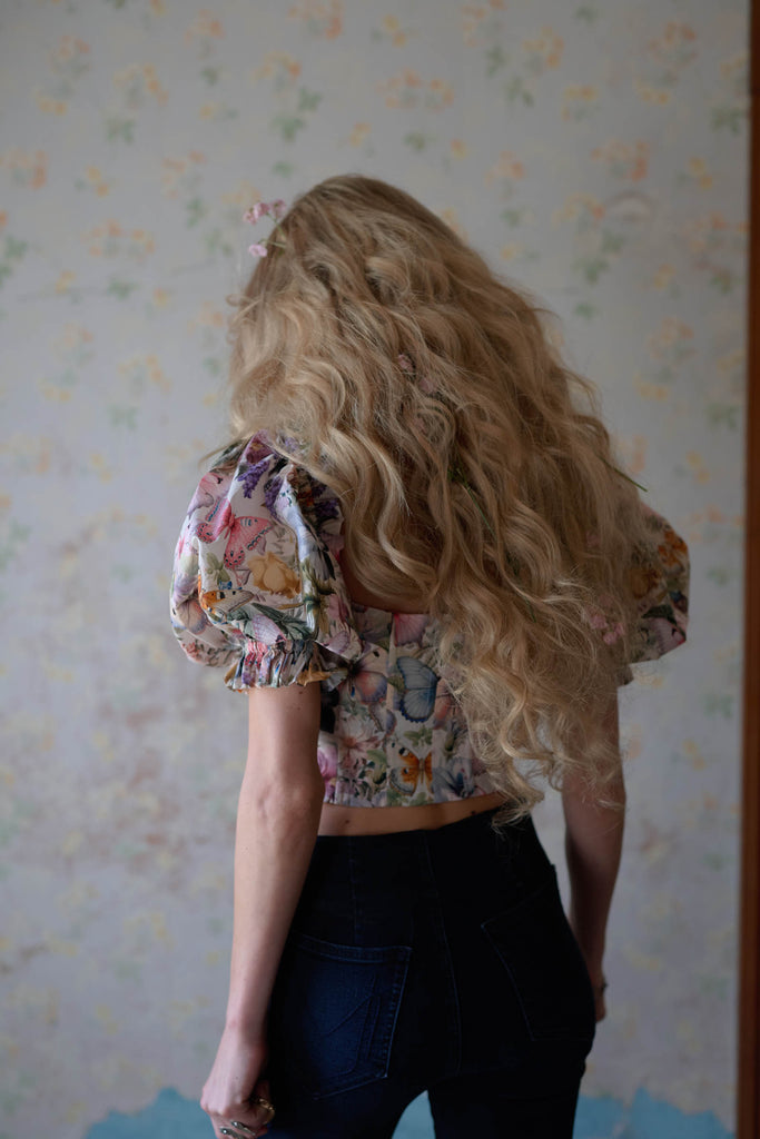 Daphne is 5’9.5” and wearing a size XS in Selkie. Her measurements are 33” bust, 24” waist, 34.5” hip.