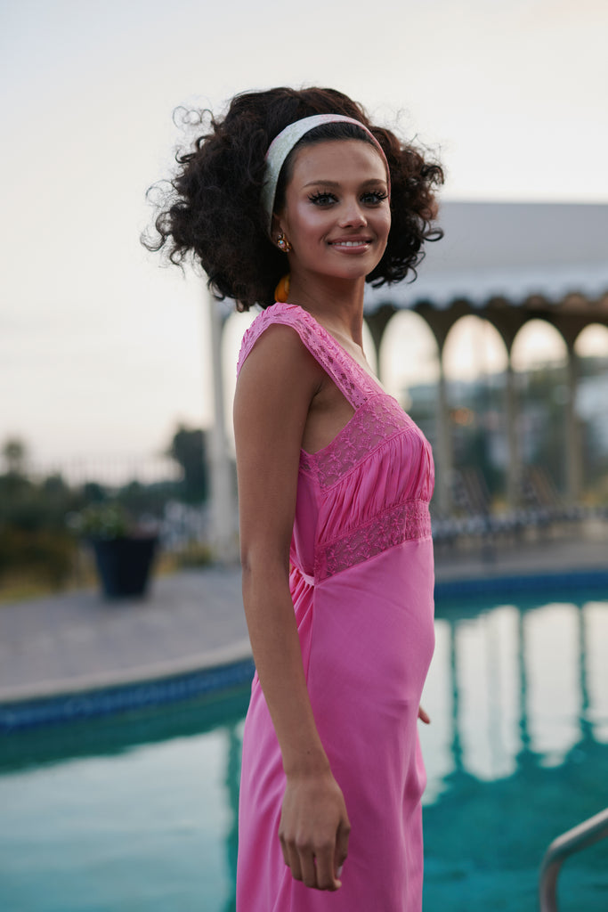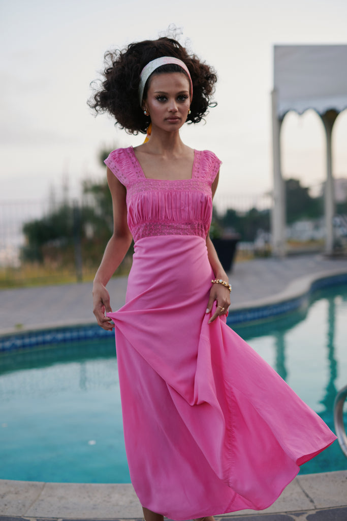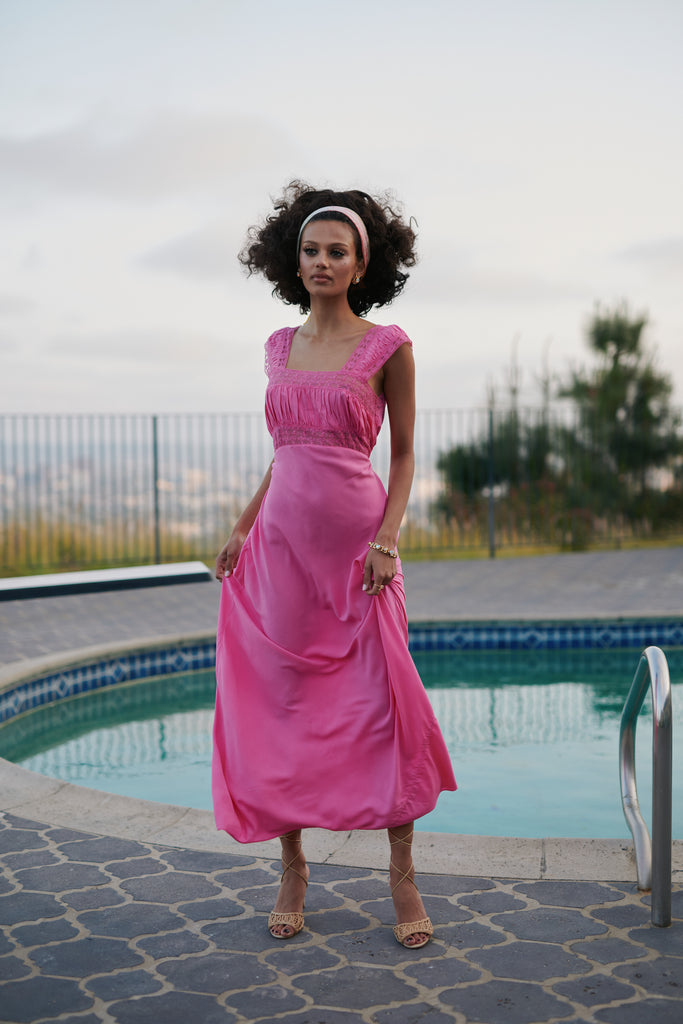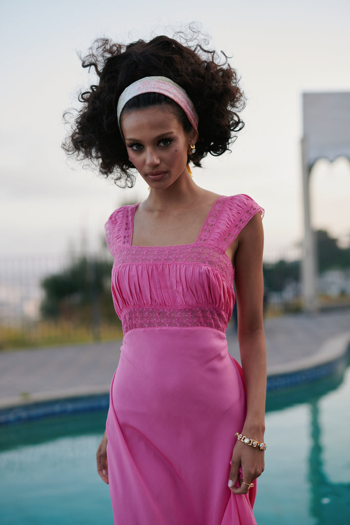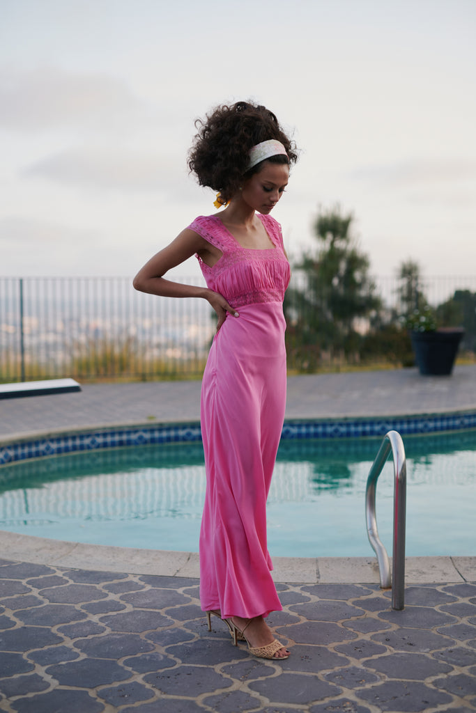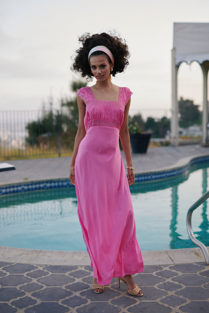Channel the spellbinding allure of Sharon Tate in Valley of the Dolls with The Cali Veronica Slip, a bright pink, cool touch rayon maxi dress that epitomizes 1960s carefree sophistication. The slip-on design ties at the back while the gathered bust, trimmed with sheer vintage lace, adds a touch of old Hollywood charm.