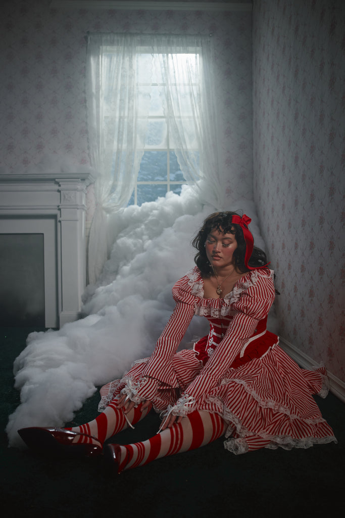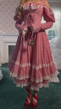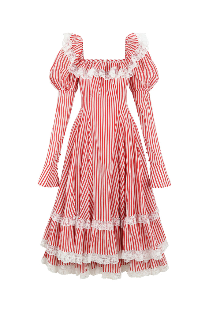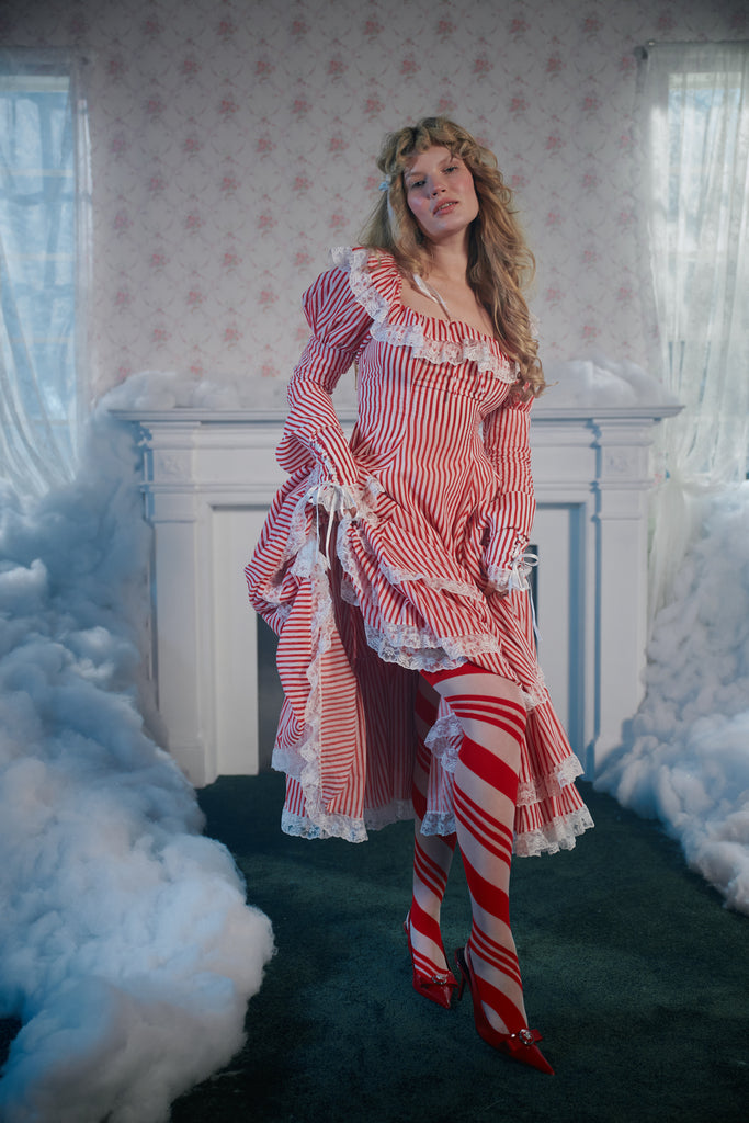 Candy cane stripes meet peppermint romance in this sheer cotton gauze midi that belongs under twinkle lights. Curve-hugging princess seams create a fitted silhouette, while the lace-trimmed collar ties sweetly at the bust, finished with Selkie's signature motton sleeves. Lace trim throughout adds sweetness to this piece made for sitting on Santa's lap, family Christmas photos, and looking like you walked out of a 90s holiday catalog.
