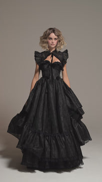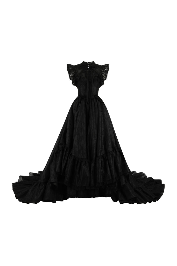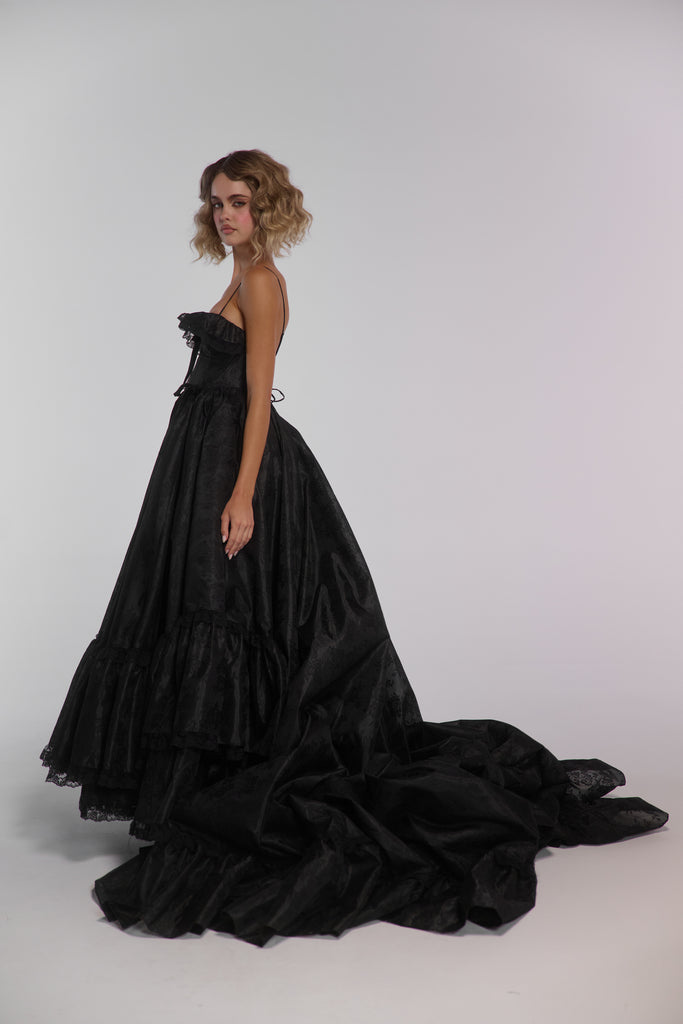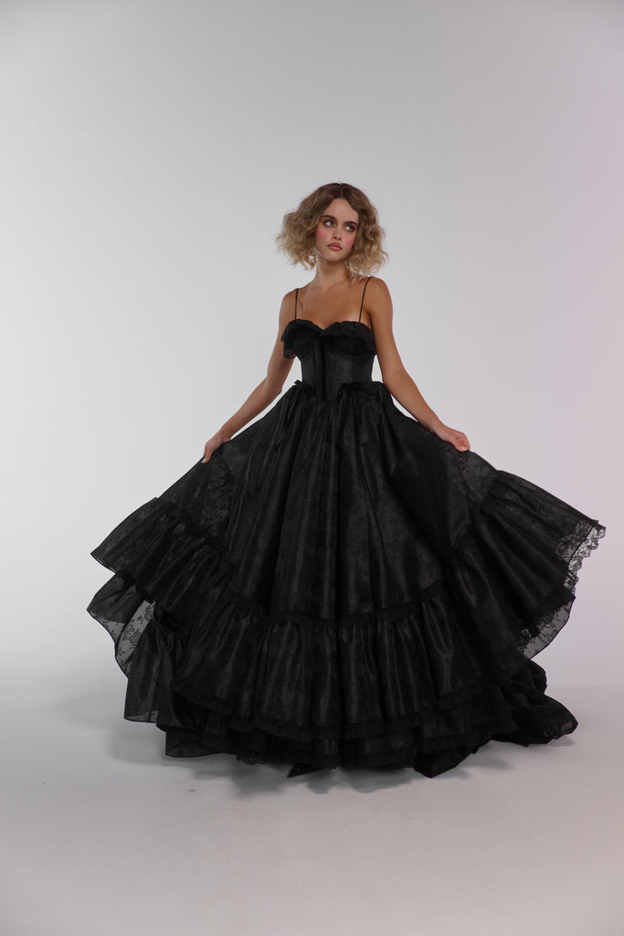 Lace overlaid organza gown with underwire cups and adjustable bustle and train