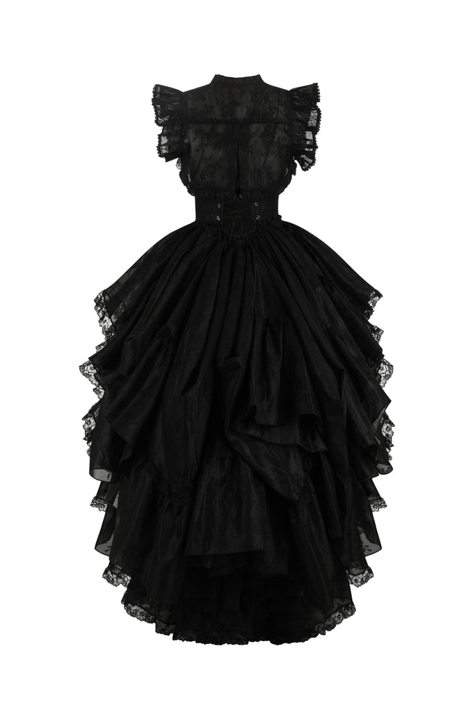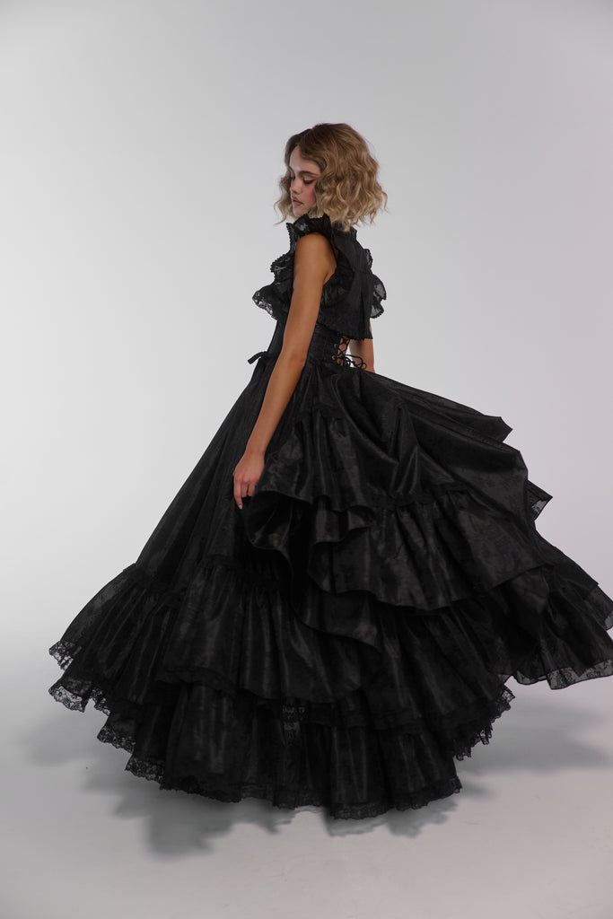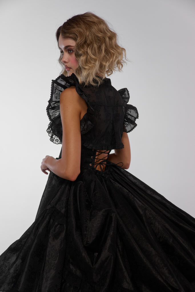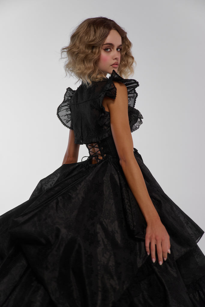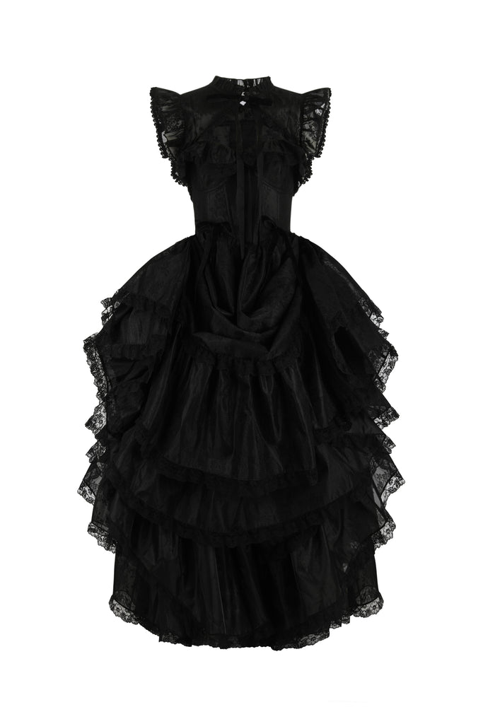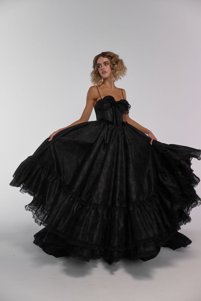 This dramatic lace overlaid silhouette features a boned bodice with delicate underwire cups, velvet bow accents, and an adjustable bustle and train that creates endless possibilities for styling. The removable lace bolero adds vintage charm, while fabric-covered buttons complete this timelessly romantic design. For the woman whose needs are few: champagne fountains at Maxim's, filet mignon, and a gown that guarantees trouble.