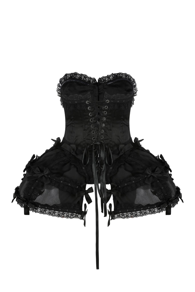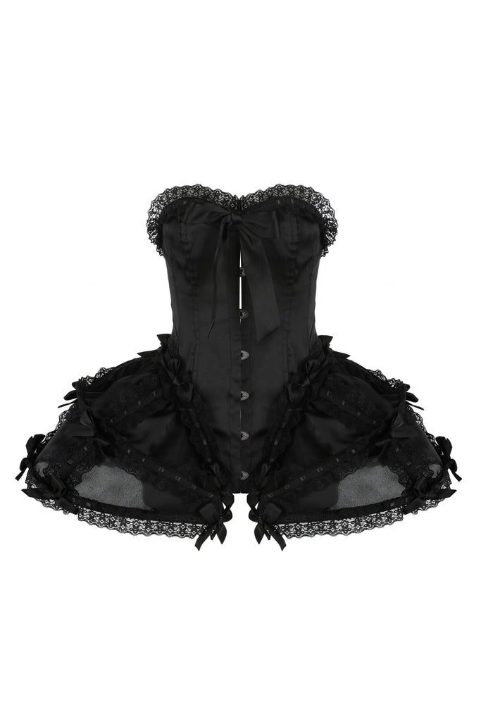 Dramatic silk basque construction meets old-world elegance in this show-stopping corset designed for the modern Libertine who wants to feel like a queen. The fully boned bodice with built-in pannier creates an enviable silhouette, while the center front busk closure and satin ribbon lace corseting at the back ensure both beauty and comfort. Trimmed with delicate ribbon lace and silk bows, this extravagant piece proves that spectacular corsetry doesn't require a palace—just the perfect foundation beneath your gown or as a stunning statement piece.
