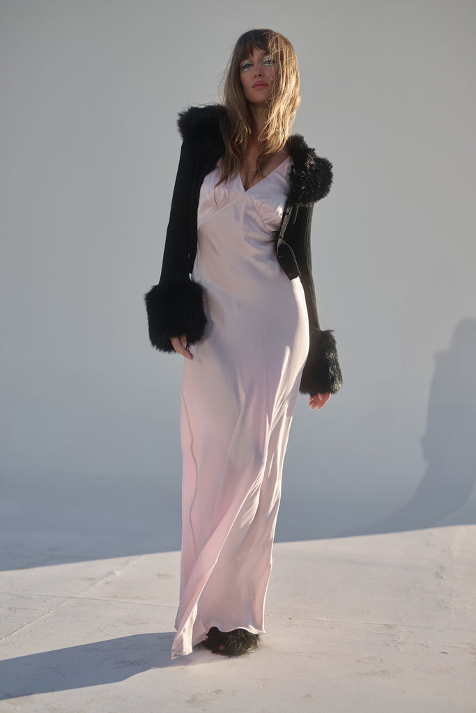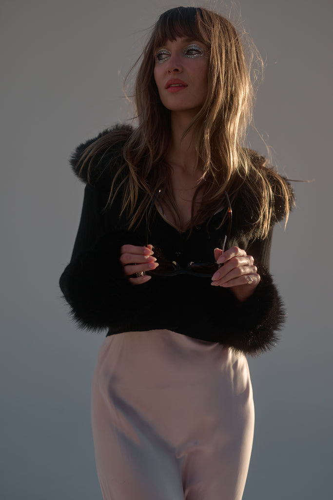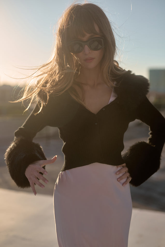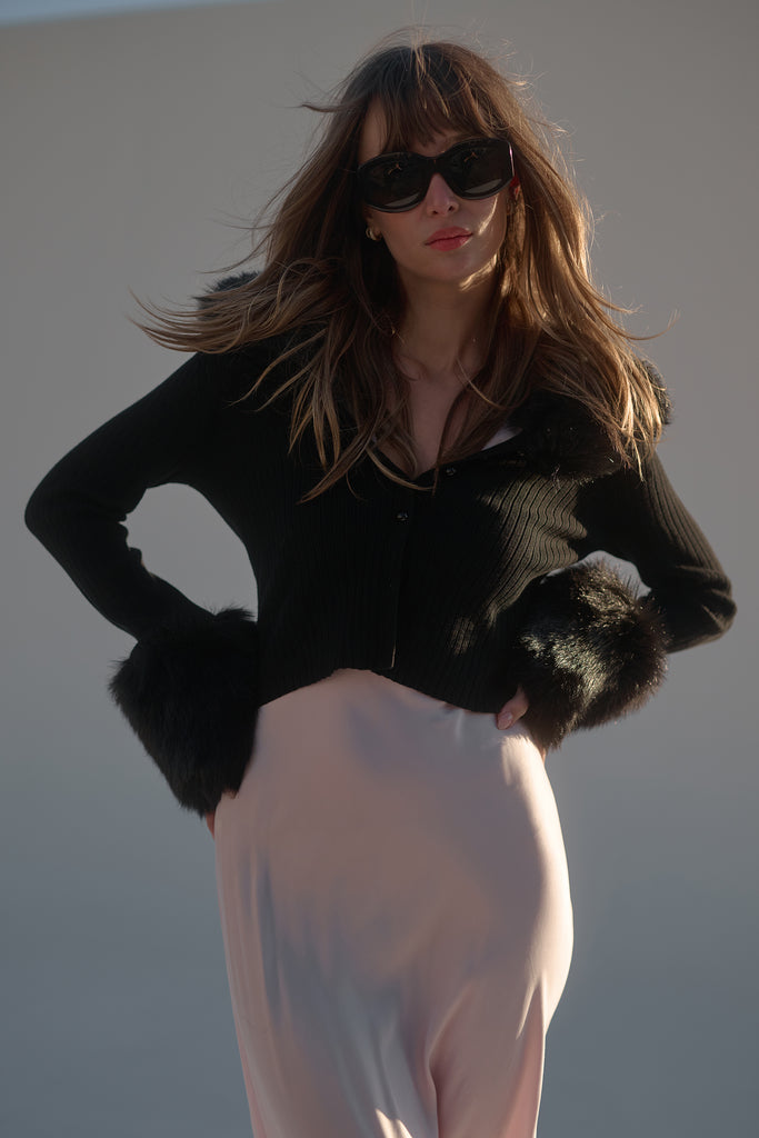 Few things exude “cool” as effortlessly as a figure skater on ice. Imagine tracing figure eights into the frozen water while adorned in The Caviar Ice Skate Home Cardi—a cropped ribbed cardigan featuring plush, warm faux fur cuffs and a matching collar.