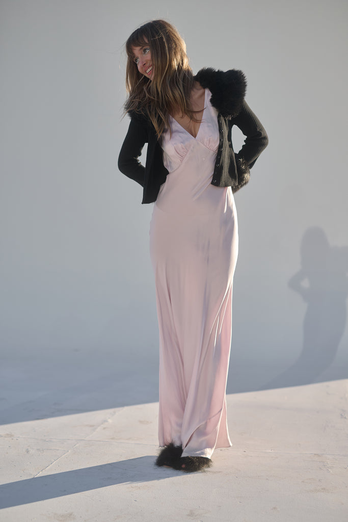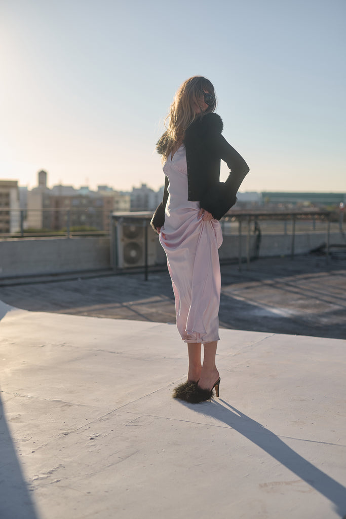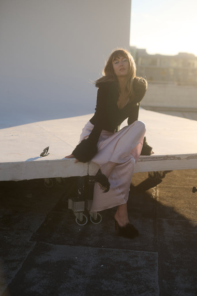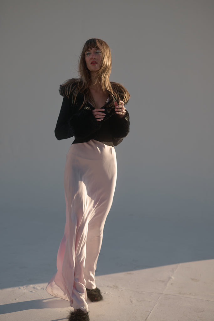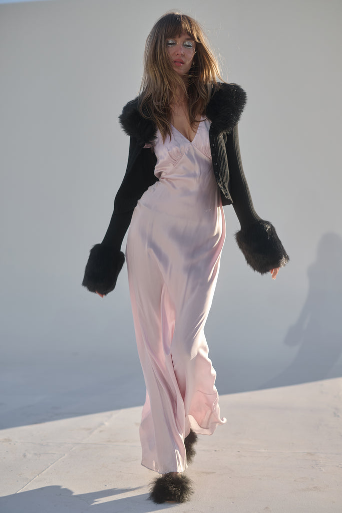 Few things exude “cool” as effortlessly as a figure skater on ice. Imagine tracing figure eights into the frozen water while adorned in The Caviar Ice Skate Home Cardi—a cropped ribbed cardigan featuring plush, warm faux fur cuffs and a matching collar.