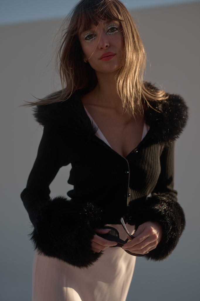 - Cropped ribbed cardigan with matching faux fur cuffs and collar