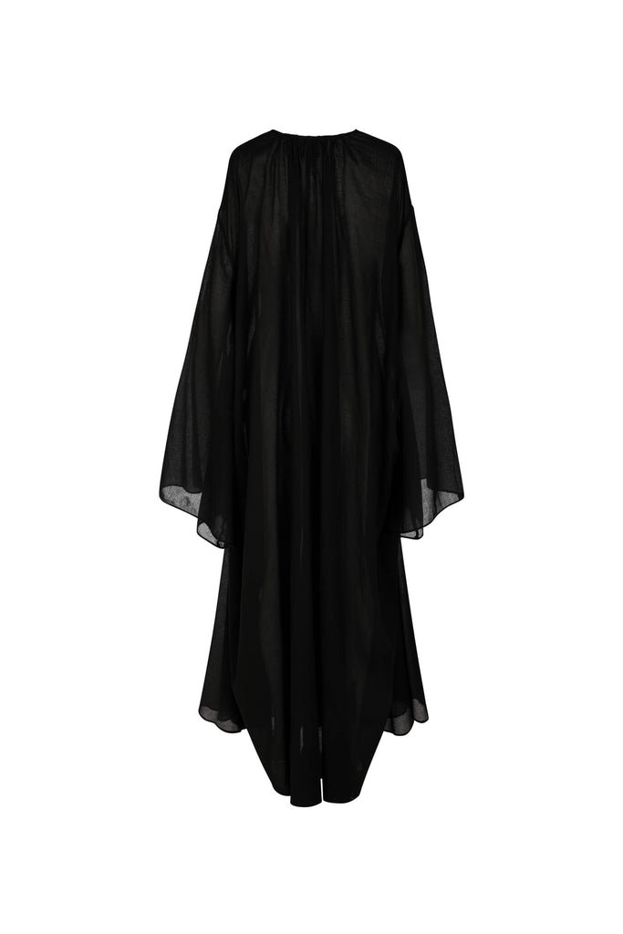 Epitomize Hollywood’s golden era with The Caviar Morning Walk Cover-Up, a sheer cotton gauze, floor-length open-front robe drenched in black. From the sparkling shores of Cannes to the desert oasis of Sinatra's Palm Springs estate, this robe's dramatic bell sleeves and adjustable ribbon drawstring bustle make it the perfect choice for indulging in vintage luxury. The lightweight fabric makes it easy to pack in your tote, and toss on quickly over any of our bathing suits. Sashay your way to the bathroom, or walk home, shoes in hand.