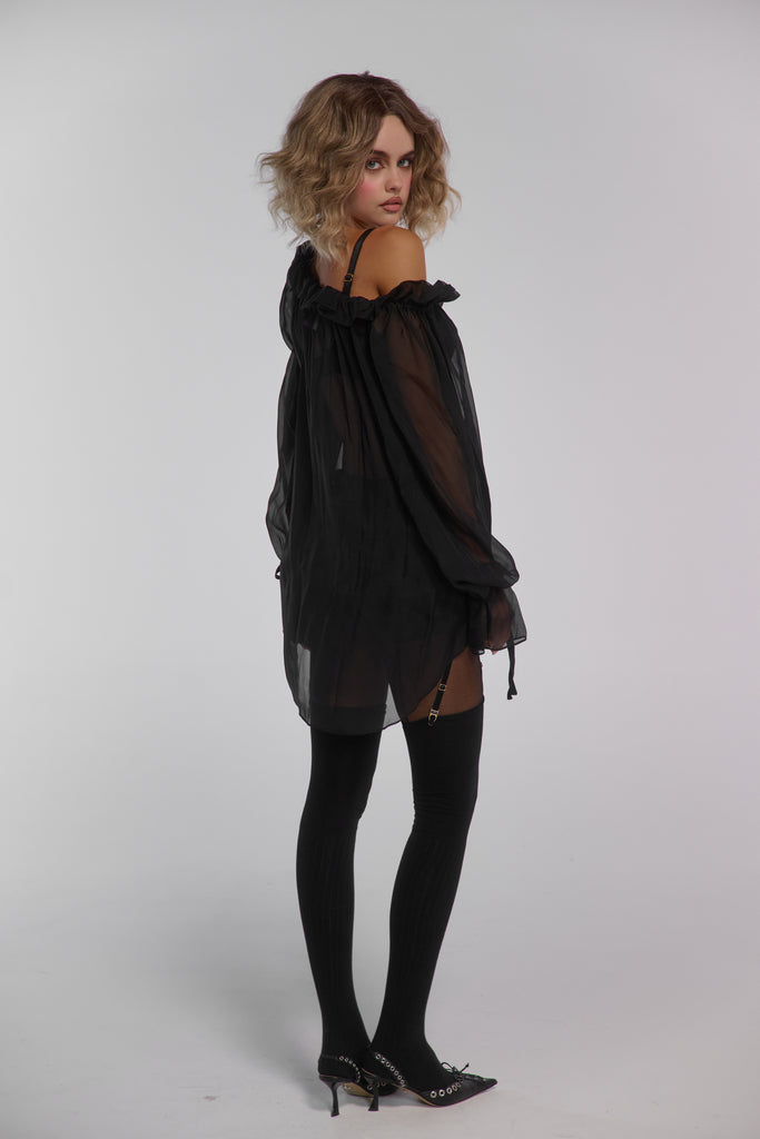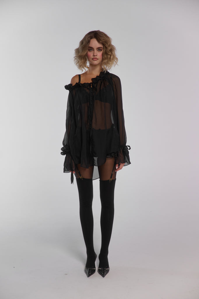 Luxurious silk chiffon drapes beautifully in this oversized blouse, offering pure luxury in a Caviar hue that layers beautifully or stands alone as a statement piece. The functional drawstring at the neck allows for customizable styling while front buttons and elastic cuffs create a refined silhouette.