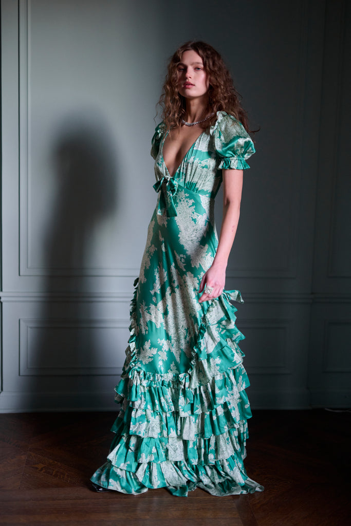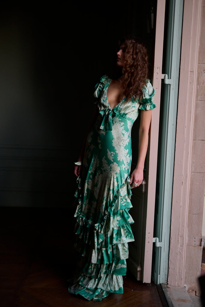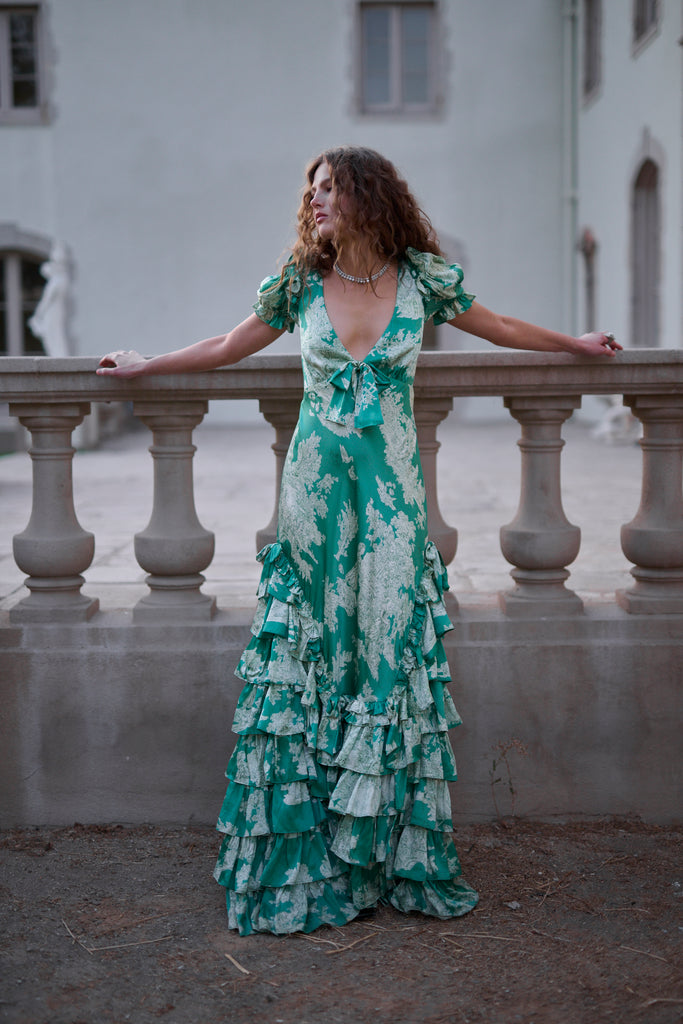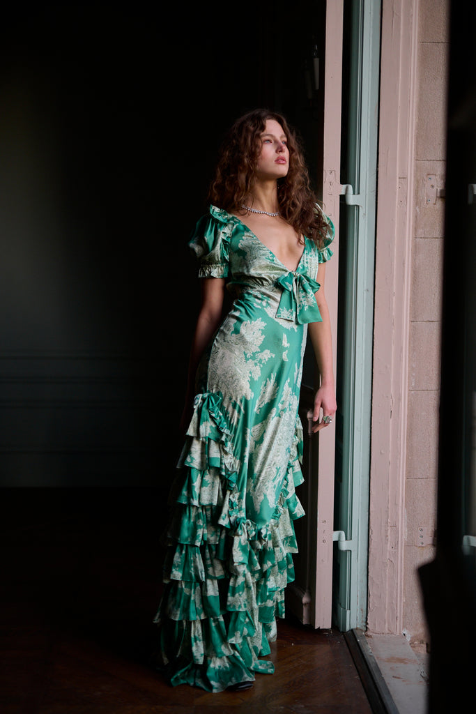 This exquisite silk slip dress captures the essence of Marie Antoinette’s Christmas celebrations at Versailles, where modern glamour meets museum portrait grandeur. Crafted from luxurious silk charmeuse, the bias-cut silhouette and pleated ruffles skim over your curves, creating a flattering and sultry fit. The bodice features delicate flutter cap sleeves and a sweetheart neckline adorned with a charming bow detail.
