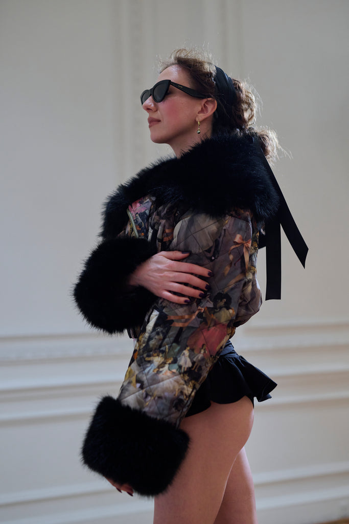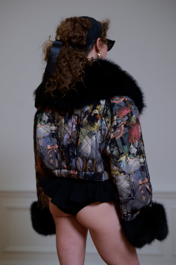Our take on the classic aviator transforms winter warmth into a peek through Degas' unflinching lens, featuring our custom print inspired by "The Dance Class"—capturing not the stage perfection, but the raw, unguarded moments of ballerinas at work. This waterproof quilted puffer features our signature oversized faux fur collar and cuffs. Precisely cropped to hit the perfect waist spot for our most voluminous dresses, it features cozy side pockets and a sturdy zipper closure.