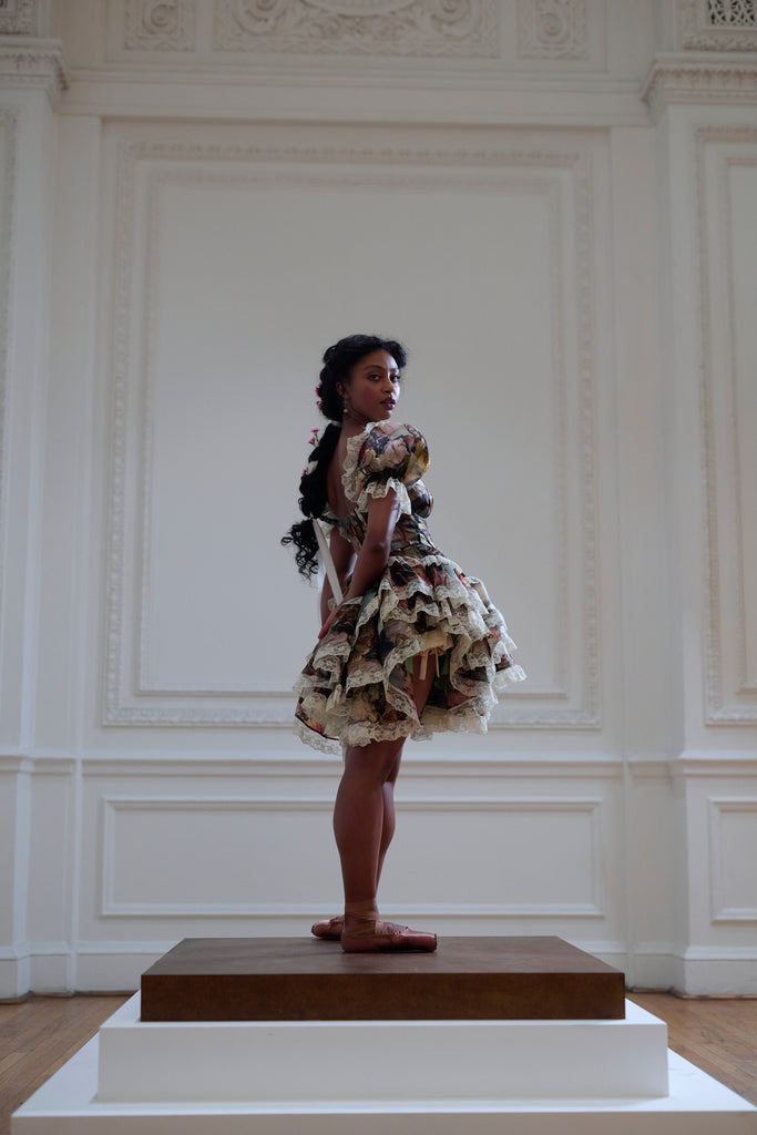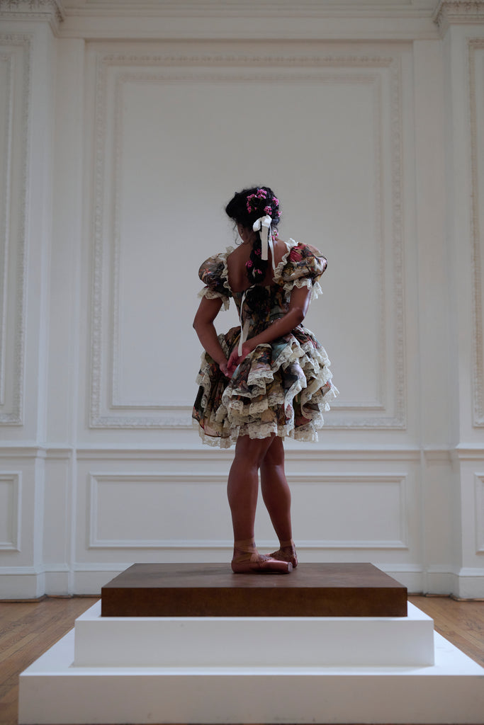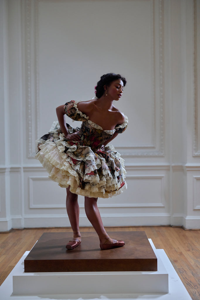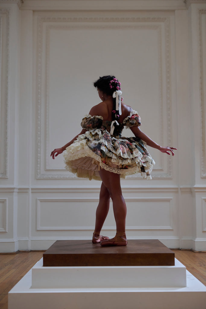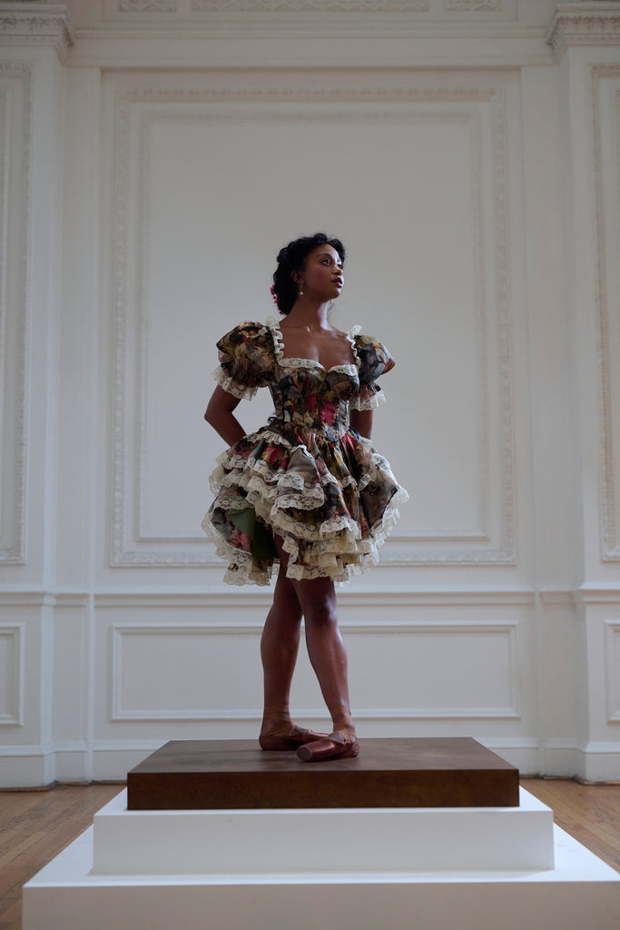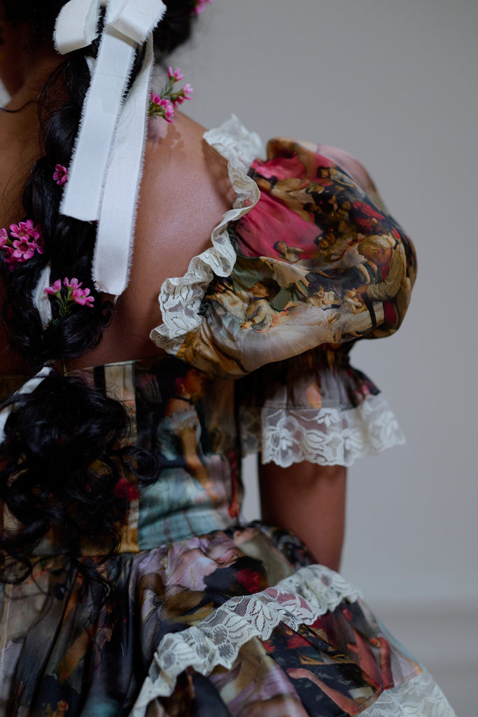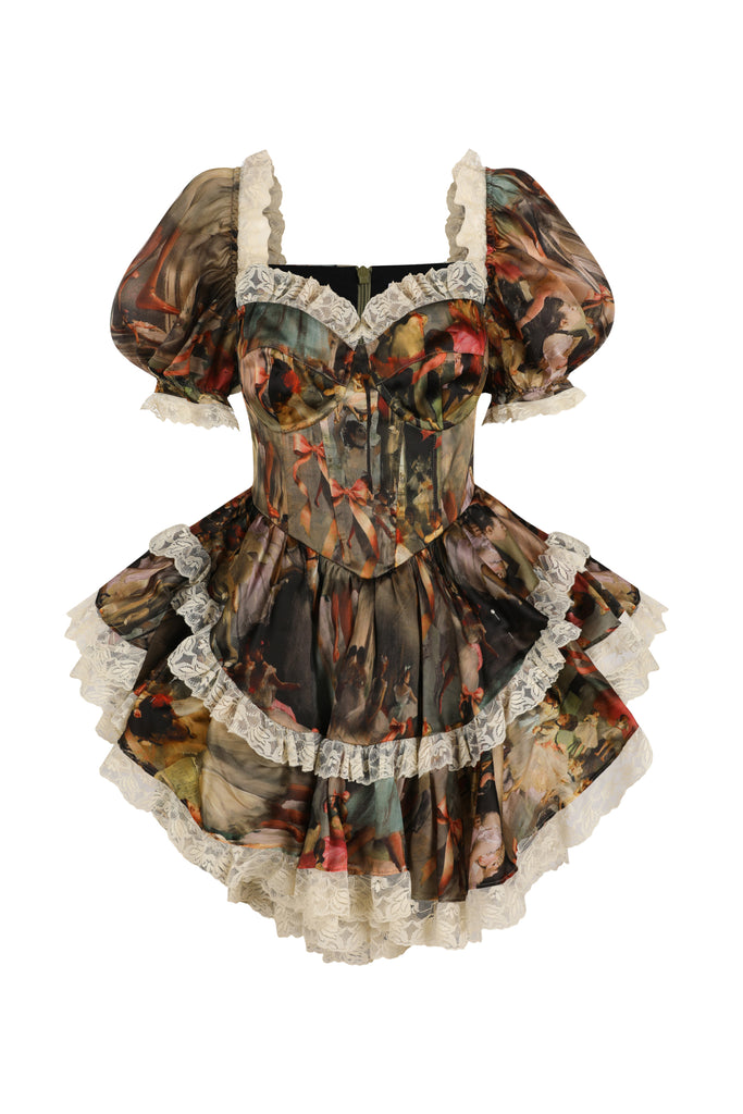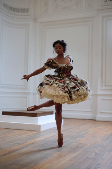 This delightfully feminine silk mini showcases a custom print honoring Degas' "The Dance Class," which captured the raw beauty of dancers in their natural state—stretching, resting, and preparing—rather than in polished performance. The voluminous pleated skirt, with its daring front-to-side sweep, creates an alluring leg-lengthening effect while the ruched bust and waist boning align to beautifully accentuate your curves. As Selkie founder Kimberley Gordon notes, 'It's probably one of the prettiest dresses we've ever made.'