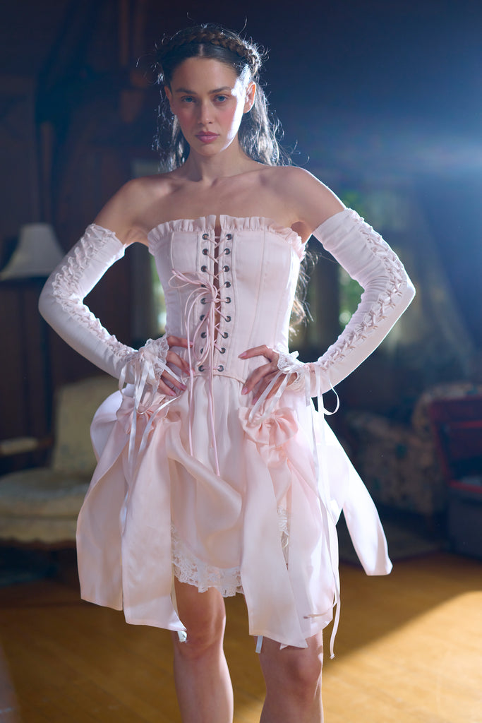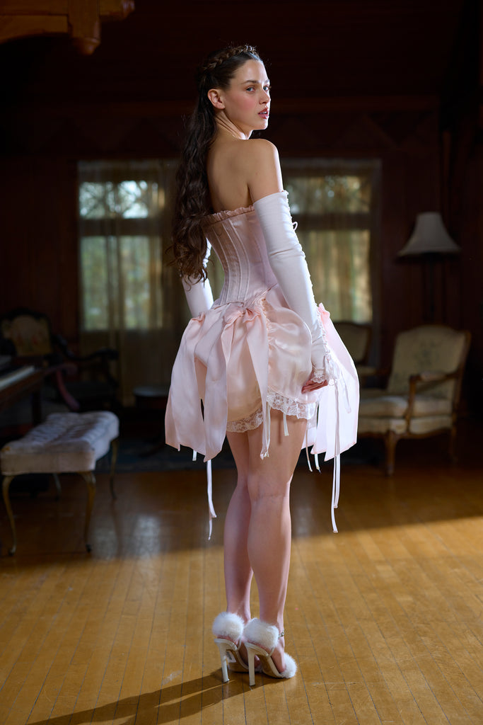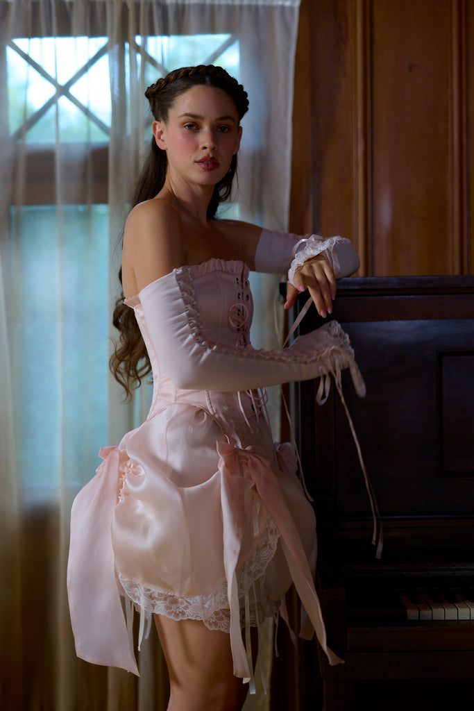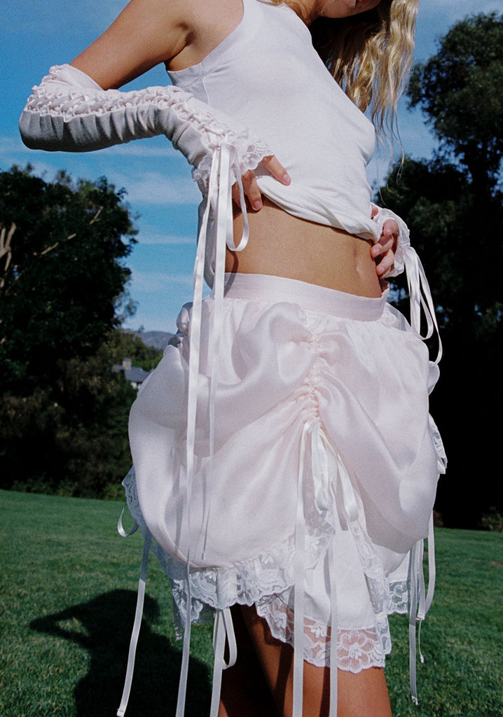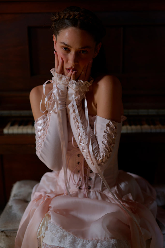 Selkie’s first arm warmers arrive in super soft, cozy modal fleece. An elegant addition to any sleeveless top, dress, or gown, these are trimmed with lace, and a satin ribbon runs corset-like from the upper arm to the wrist. Savor the visual decadence of Confection, where this delicate, airy pastel looks sweeter than a cream puff dusted with snow powdered sugar.