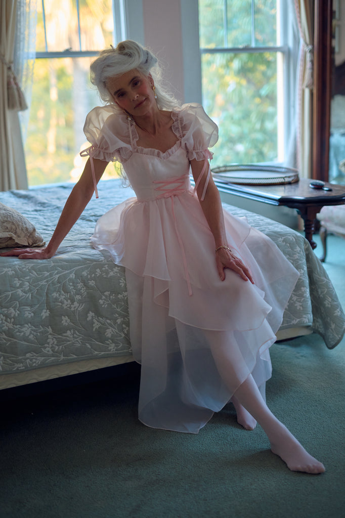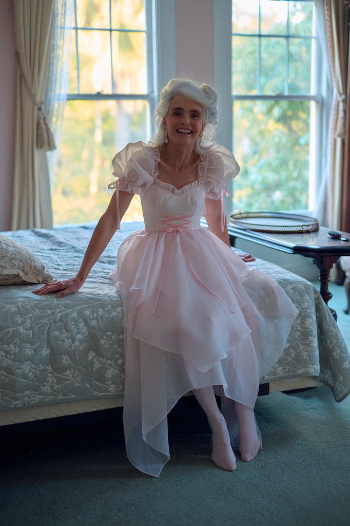 Julie is 5’9” and wearing a size XXS in Selkie. Her measurements are 34” bust, 24” waist, 34” hip. For more specifics, please text our help line.
