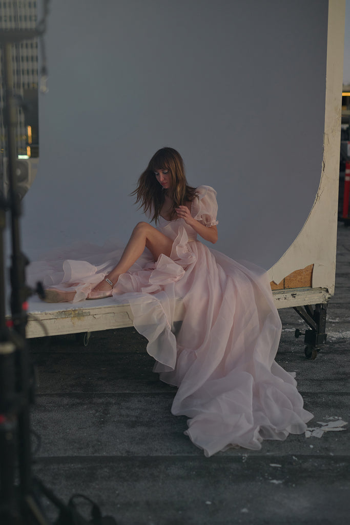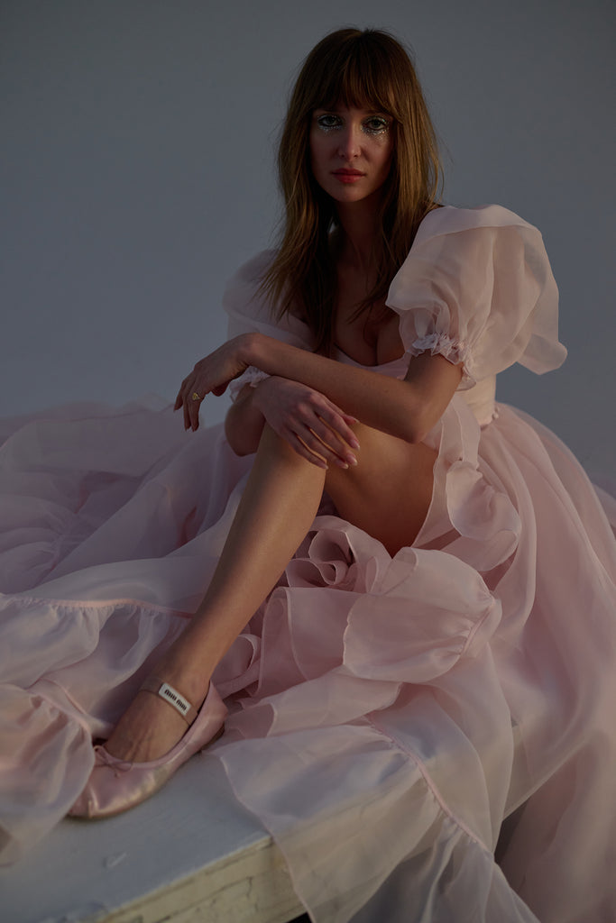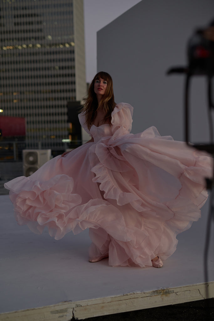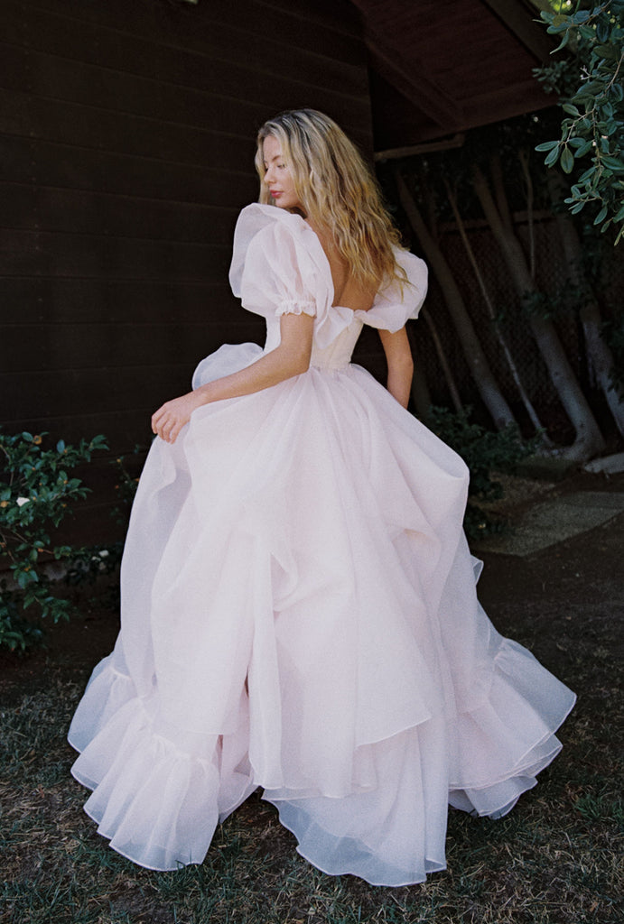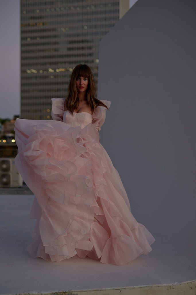 Countdown to midnight in a gown fit for a rather *provocative* queen, featuring a liberally drawn ruffled leg slit, and layers and layers of voluminous skirt, resembling the blush pink frosted swirls atop a decadent cupcake. Shoulder ruffles at the sleeve and underwire cups highlight the bust. The devastatingly dramatic bustling skirt—which can be worn bustled up for a bouffant effect or down for a seriously glamorous train—is the standout feature of this unforgettable gown.