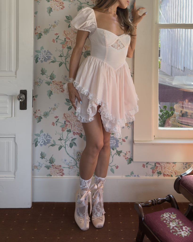 In airy cotton gauze and Confection pink, this softly feminine gown feels as though it’s been plucked from the pages of a fairytale. This handkerchief-style piece features dreamy elastic puff sleeves and a sheer lace detail at the bust. The petticoat bustles into a mini skirt for added volume, perfect for trimming your rose trellises or braiding daisies.