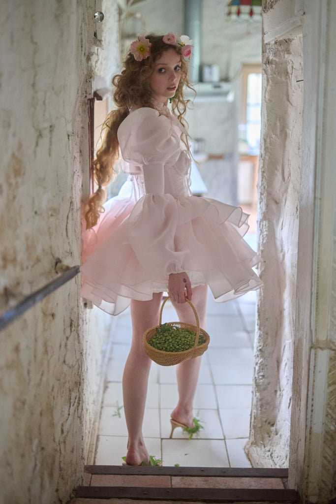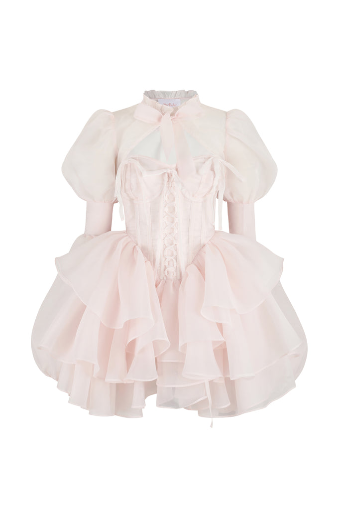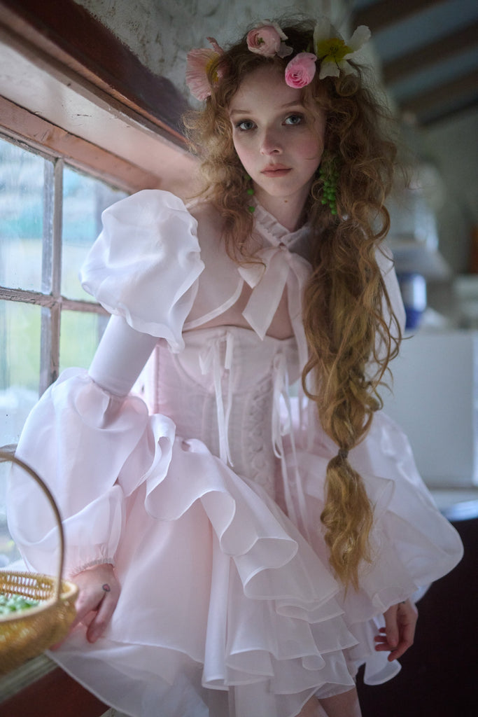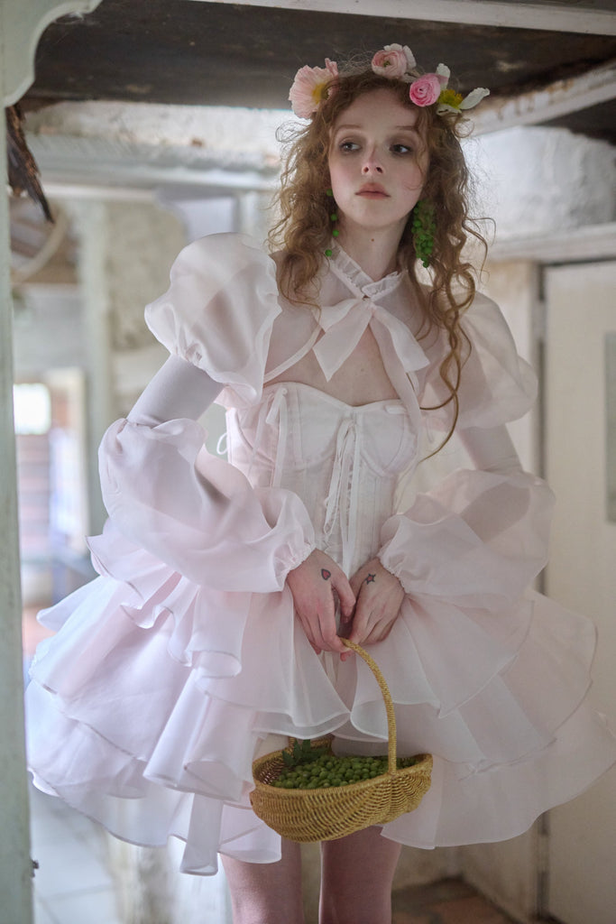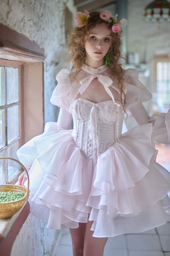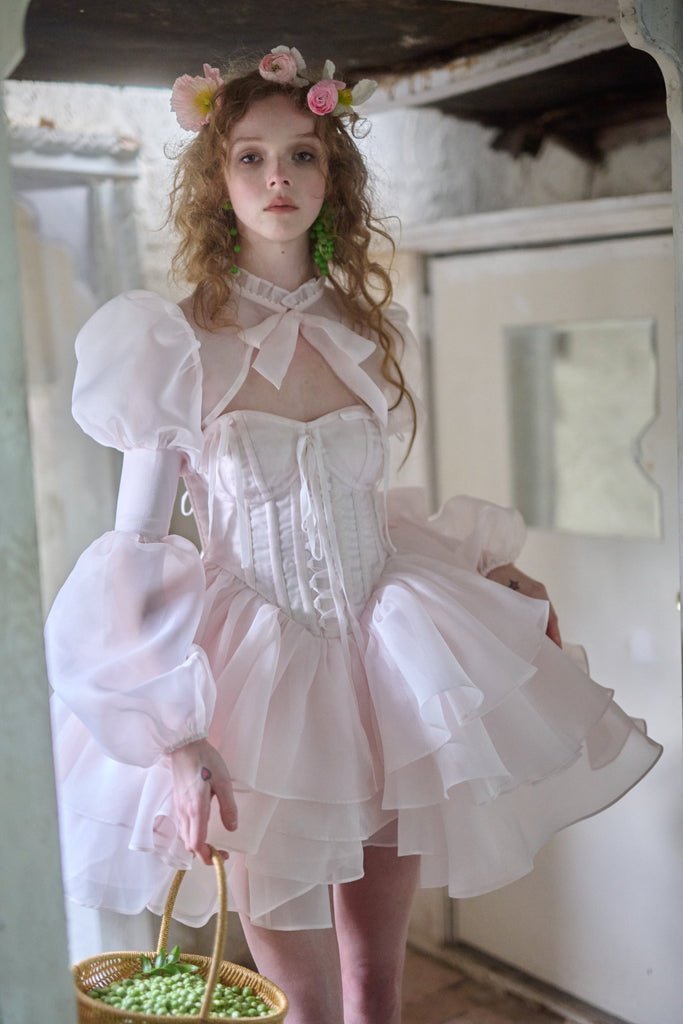 Made in a sweet Confection pink reminiscent of pastel pastries, this strapless floaty organza mini dress commands center stage with its Basque-waist silhouette and corseted bodice featuring underwire cups and structured boning—a magnificent look worthy of any theatre girl's ultimate stage finale. The removable bolero with bubble sleeves transforms the silhouette, while velvet ribbon piping traces each seam with Shakespearean elegance—a costume worthy of Ophelia's final soliloquy.