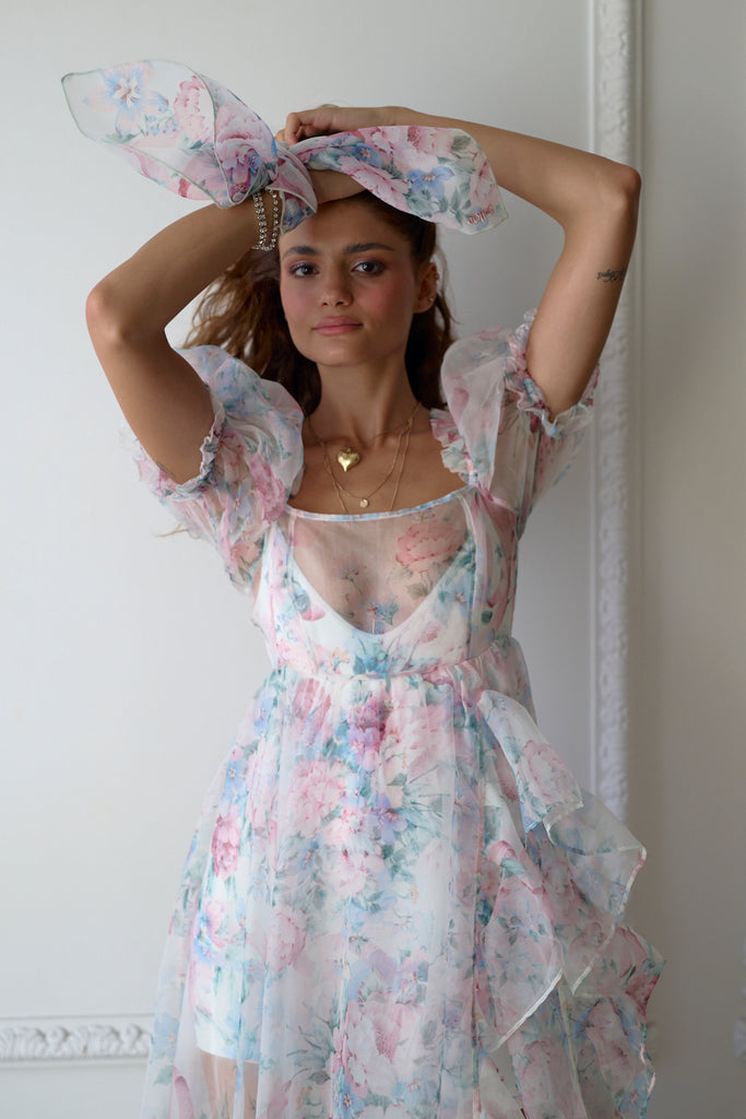 Featuring an empire waist and circle cut ruffle-slit skirt, this stunning sheer gown comes with a low-back bodysuit that can be removed and swapped out for lingerie. You’ll love the bodysuit on its own, too. This print was designed to conjure up the Cotswolds, a region in England that is designated as an Area of Outstanding Natural Beauty (AONB).
