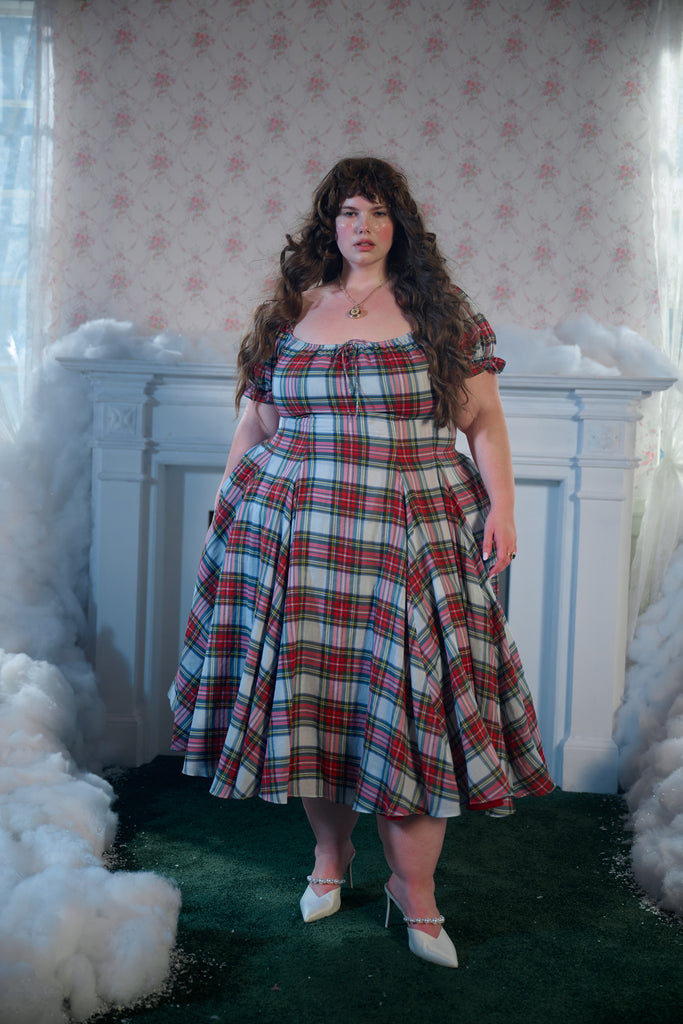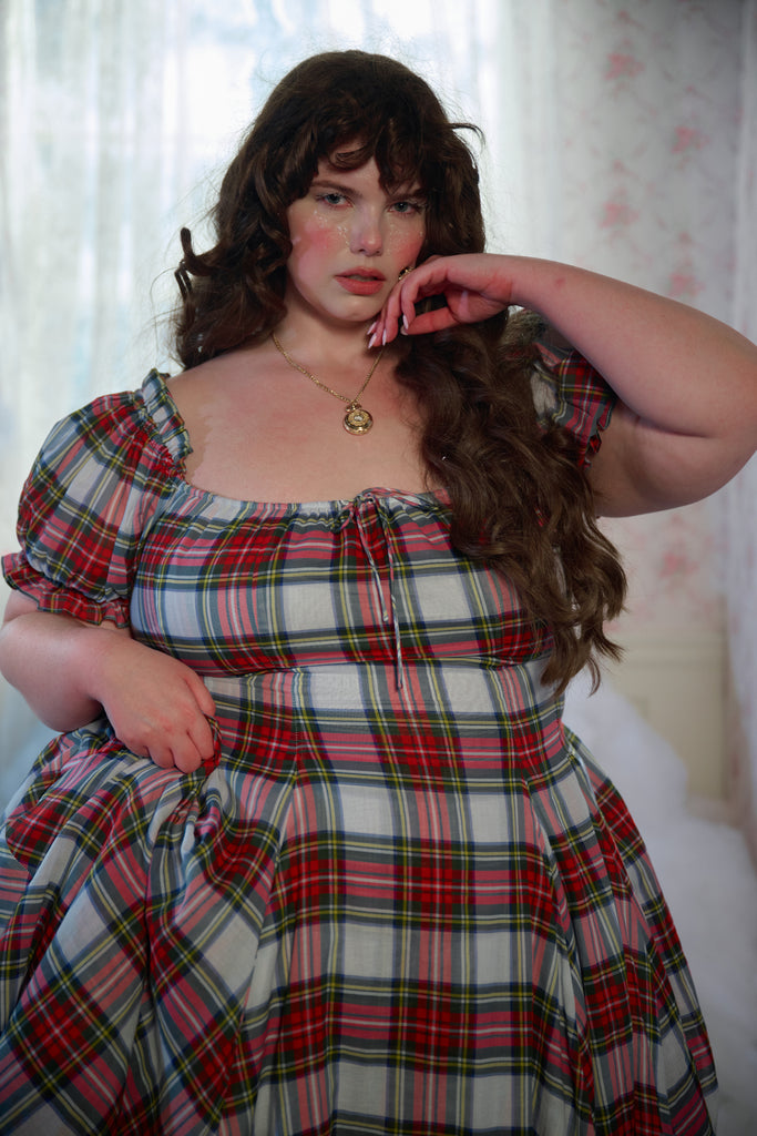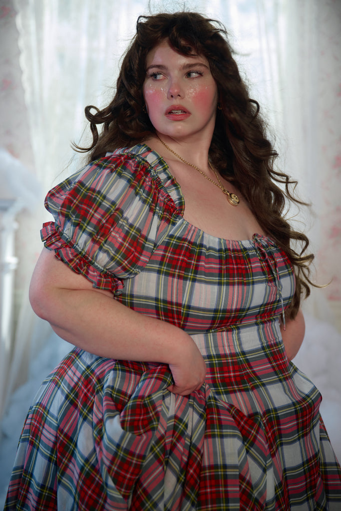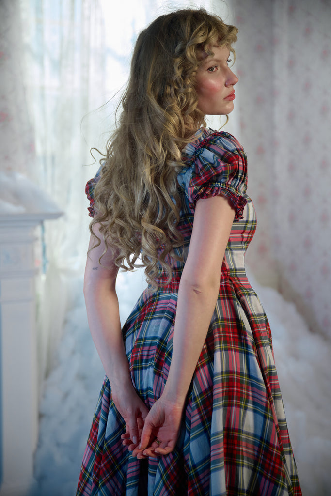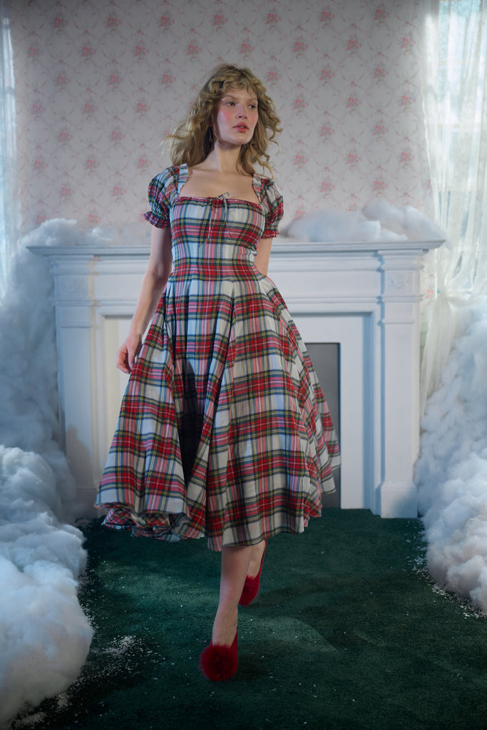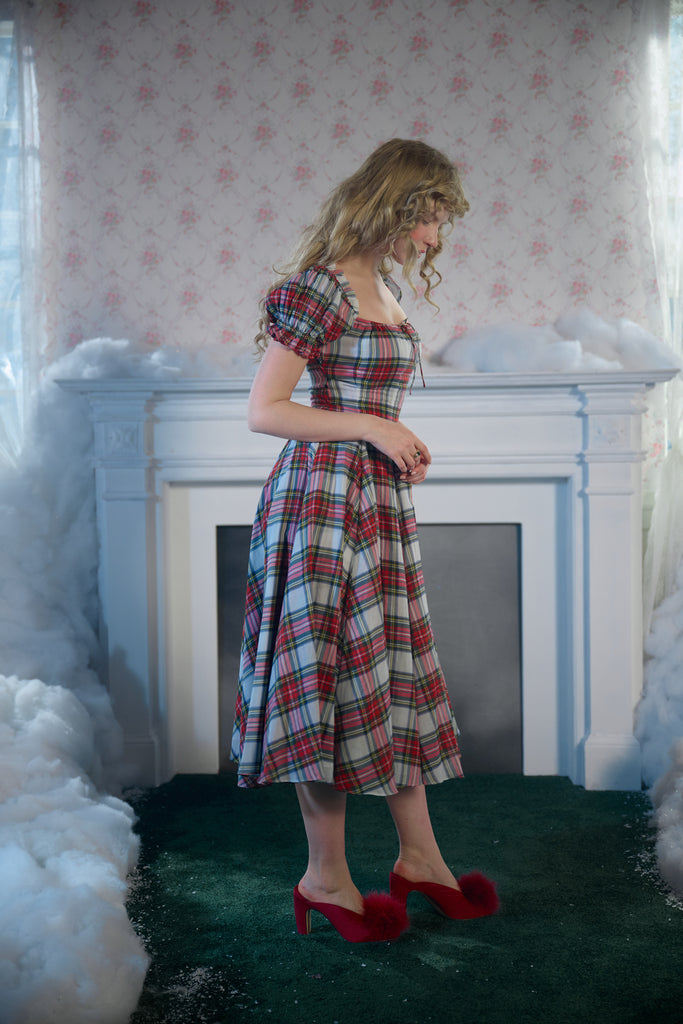 This cotton gauze Party Dress captures founder Kimberley Gordon's UK childhood Christmases, evoking Edinburgh's festive season with its snow-dusted cobblestones and twinkling shop windows. Puff sleeves paired with a dainty bust tie frame your silhouette, while a voluminous circle skirt with cleverly placed gussets enhance your shape. Made for seasonal celebrations, holiday tea parties, and moments that feel like a Christmas story.