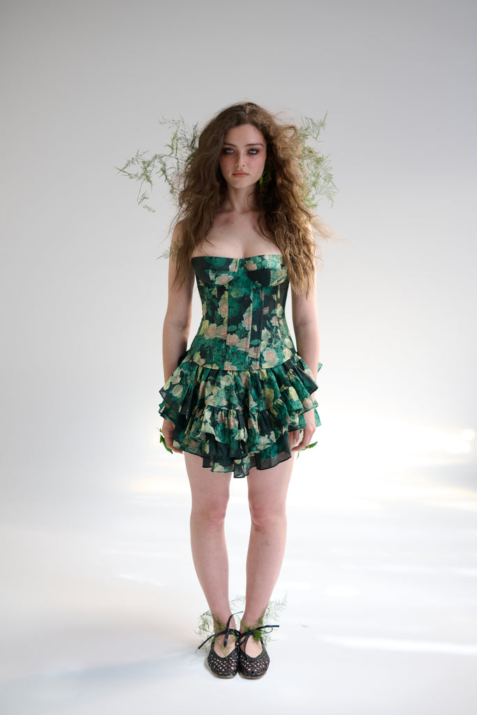 Crafted from sheer silk organdy, this strapless bustier unfurls with blooming roses in a shadowed woodland—an ode to slumbering royalty and the magic that keeps them dreaming... The fully boned construction with underwire cups and non-slip bias elastic ensures a secure fit, while dual draw cords at the back allow for customizable cinching.