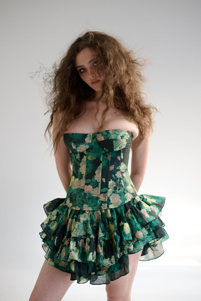 This silk organdy Basque-waist mini skirt captures the essence of forgotten fairy tales with its half-smocked waistband providing both structure and grace. Delicate layers create a dreamlike silhouette while the twilight print showcases rich, dark roses blooming throughout a shadowy forest, surrounding slumbering princesses caught in powerful enchantments.