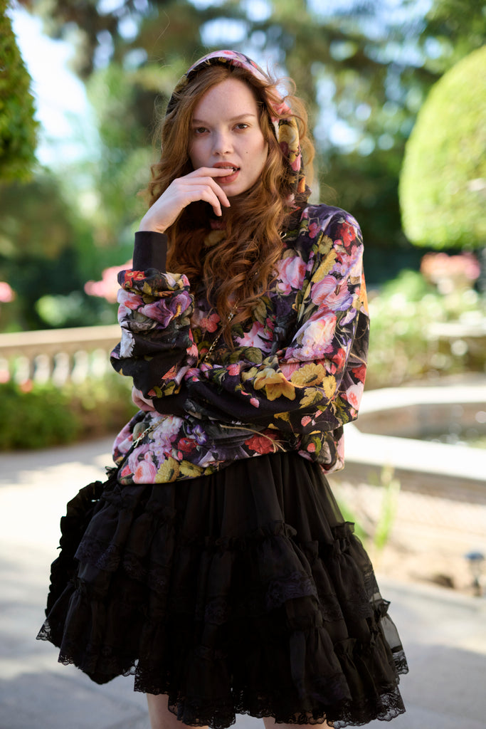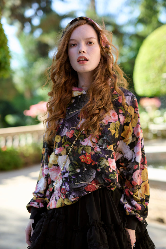Fête des fleurs translates to festival of flowers, and was collaged from an 18th century still life painting. You’ll feel as if you stepped off of the museum walls and into the evening, a perfect muse in a gorgeous, gothic floral. Just in time for early sunsets, fragrant cocktails, dark flowers and good friends at the table.