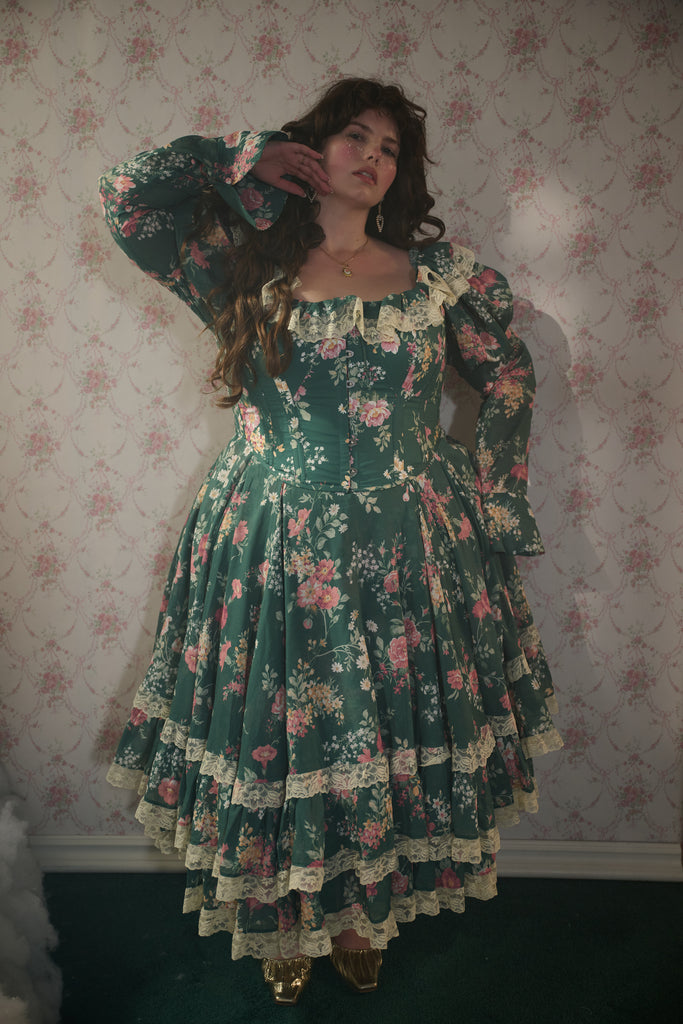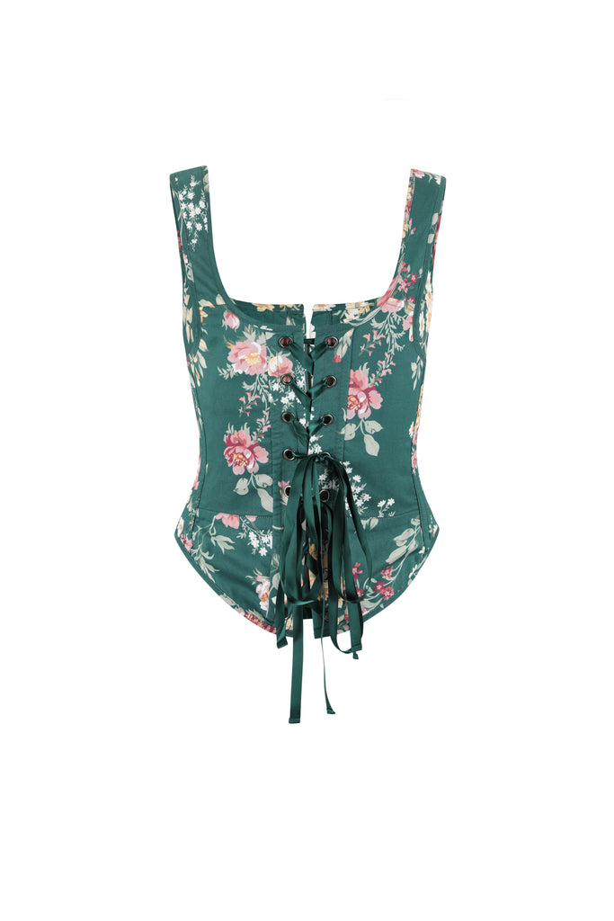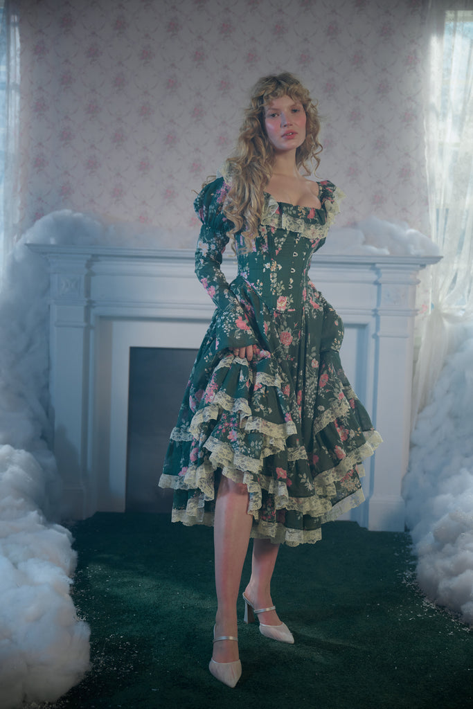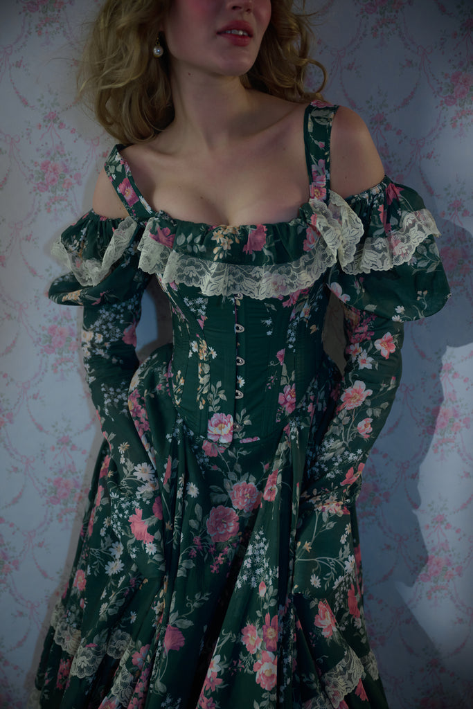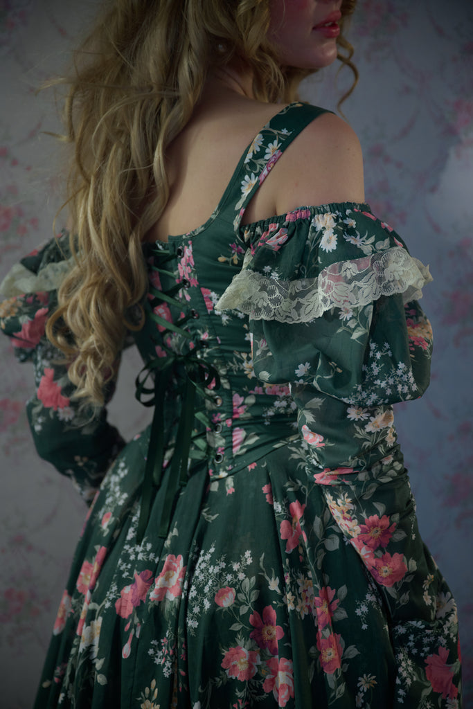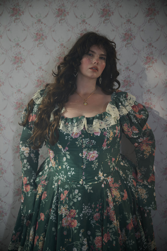This seriously nostalgic print might bring you right back to the 80s holiday season. Whether you grew up watching Anne of Green Gables or not, it's never too late to start. With many iterations of the show available, it's worth cozying up to this season. This heavy cotton Basque waist corset features boning at the bodice for structured elegance, lacing up the back with two draw cords for adjustable fit, finished with a split busk closure at front for easy dressing. This luscious green floral print was inspired by Anne's winter adventures in Green Gables—shopping for a rare present, strolling through an 1800s snowy village, or building forts in the snowy woods.