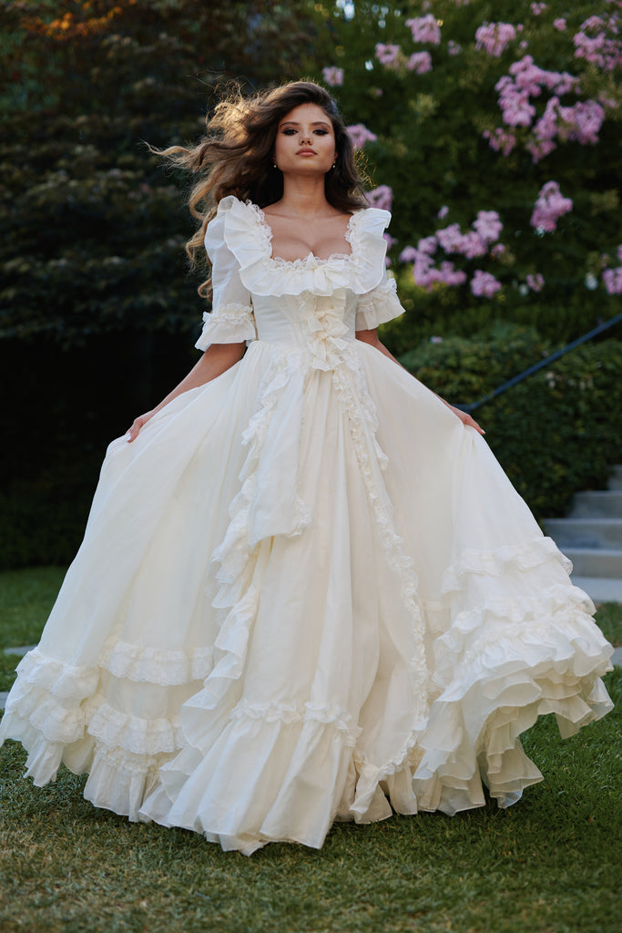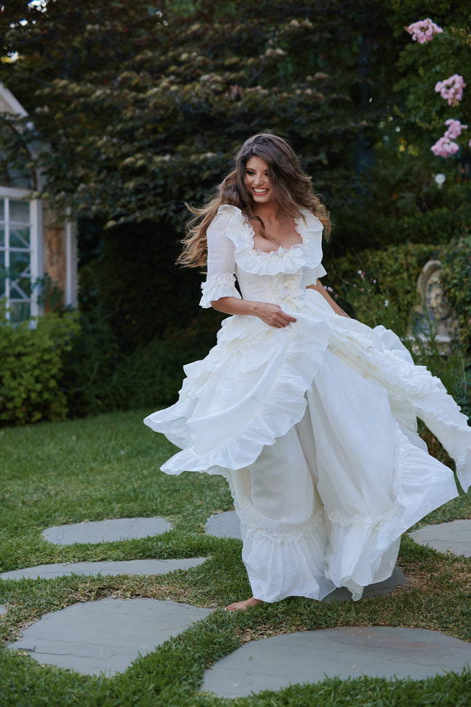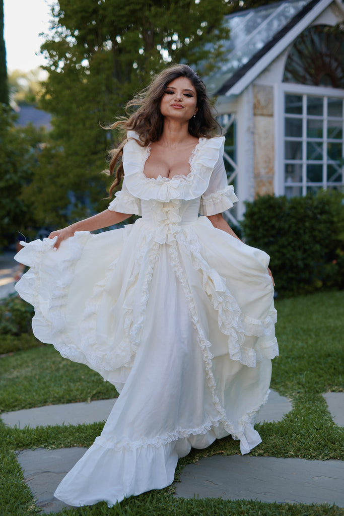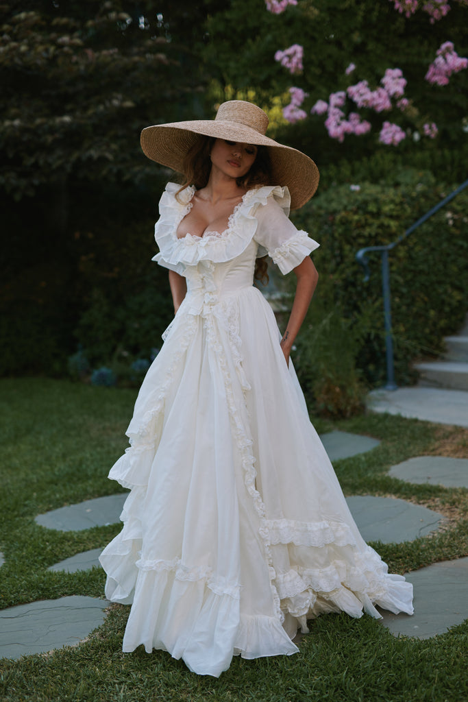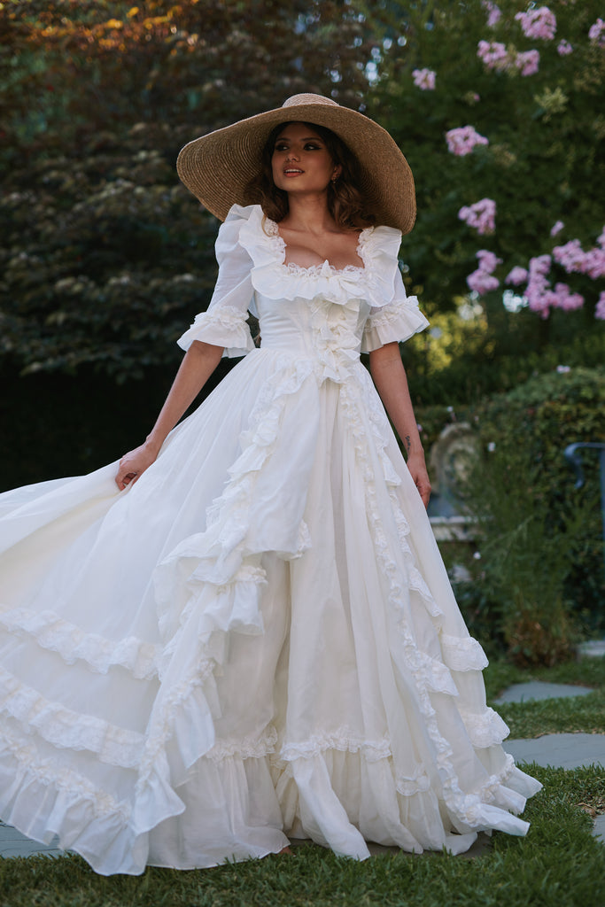 This silk organdy gown channels Marie Antoinette's Austrian background—the most extravagant piece in our collection, yet understated in its own romantic way. Imagine what the queen would wear while playing farm girl on her estate grounds: pleated ruffle details and bows throughout, mid-length sleeves with bubble cuffs, and a bustle that creates dreamy movement. Boning at the waist ensures a regal silhouette for your intimate wedding, where royal romance meets backyard celebration in the most enchanting way.