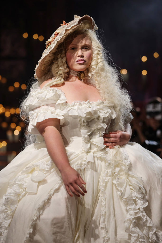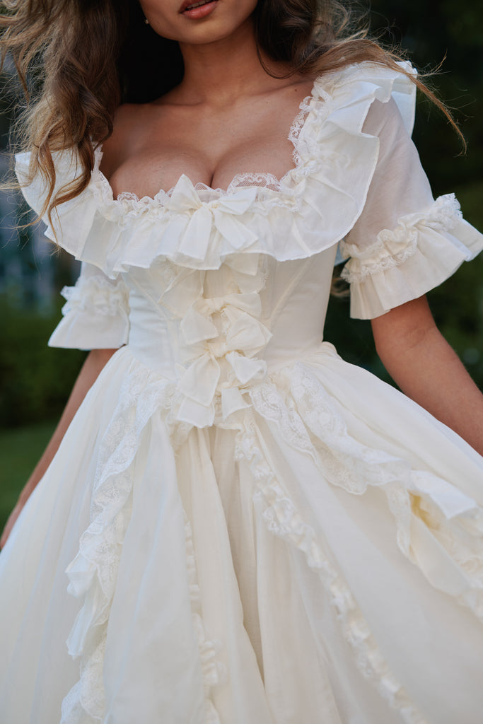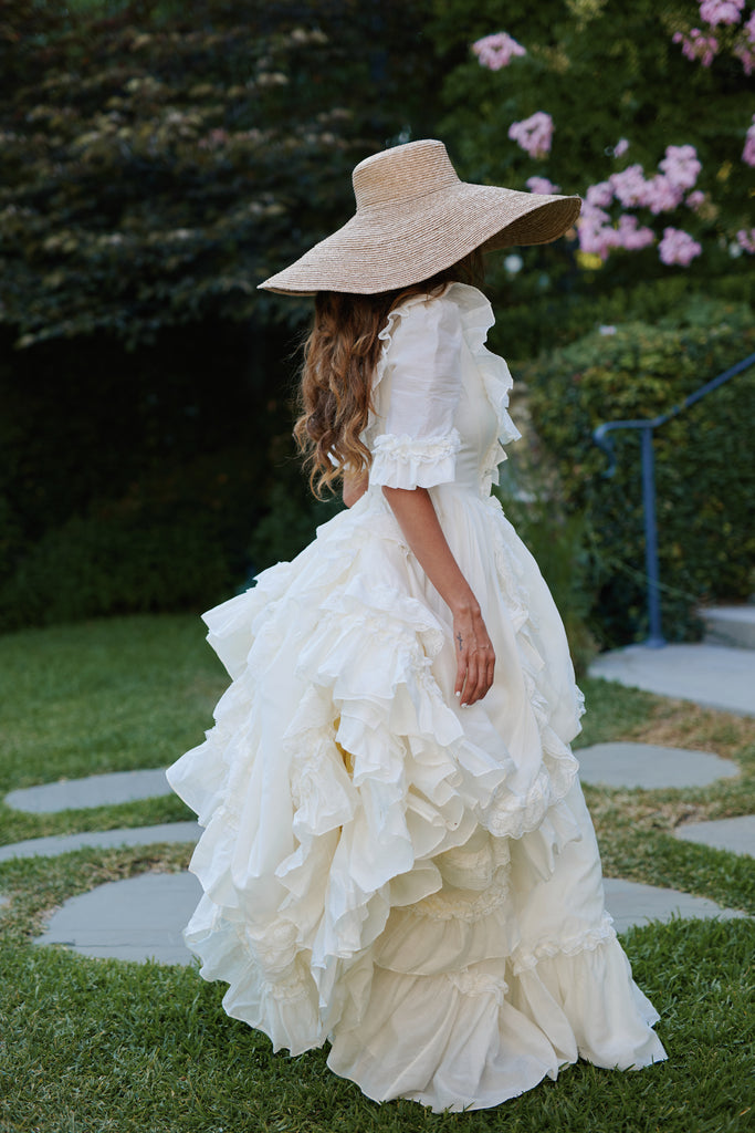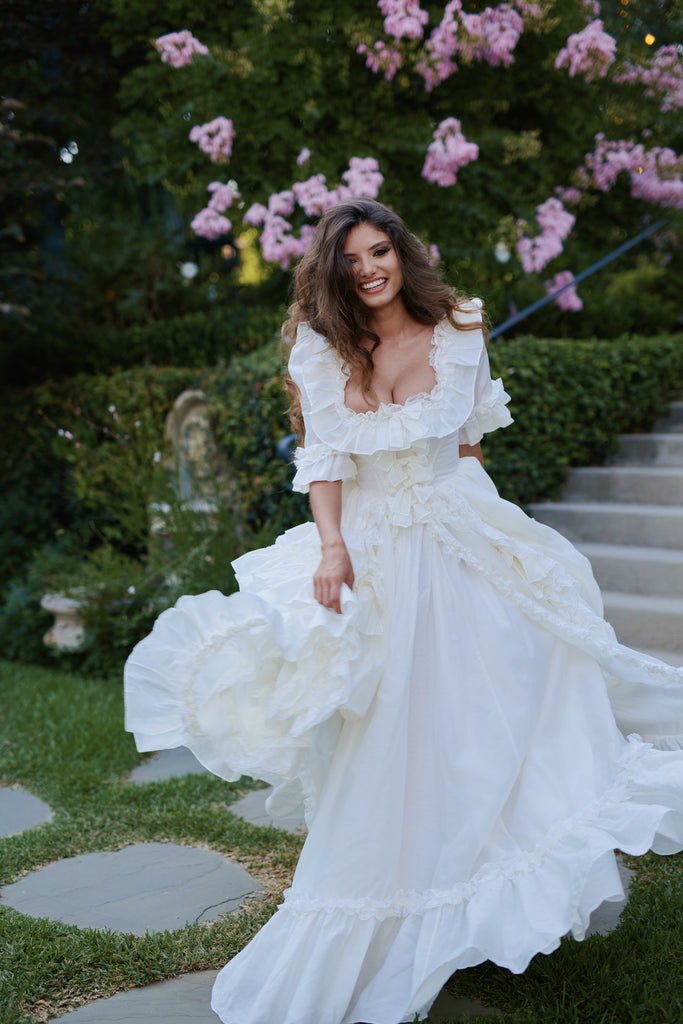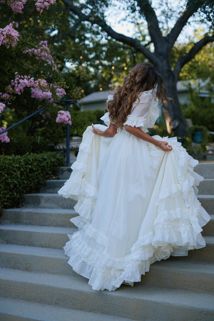This silk organdy gown channels Marie Antoinette's Austrian background—the most extravagant piece in our collection, yet understated in its own romantic way. Imagine what the queen would wear while playing farm girl on her estate grounds: pleated ruffle details and bows throughout, mid-length sleeves with bubble cuffs, and a bustle that creates dreamy movement. Boning at the waist ensures a regal silhouette for your intimate wedding, where royal romance meets backyard celebration in the most enchanting way.