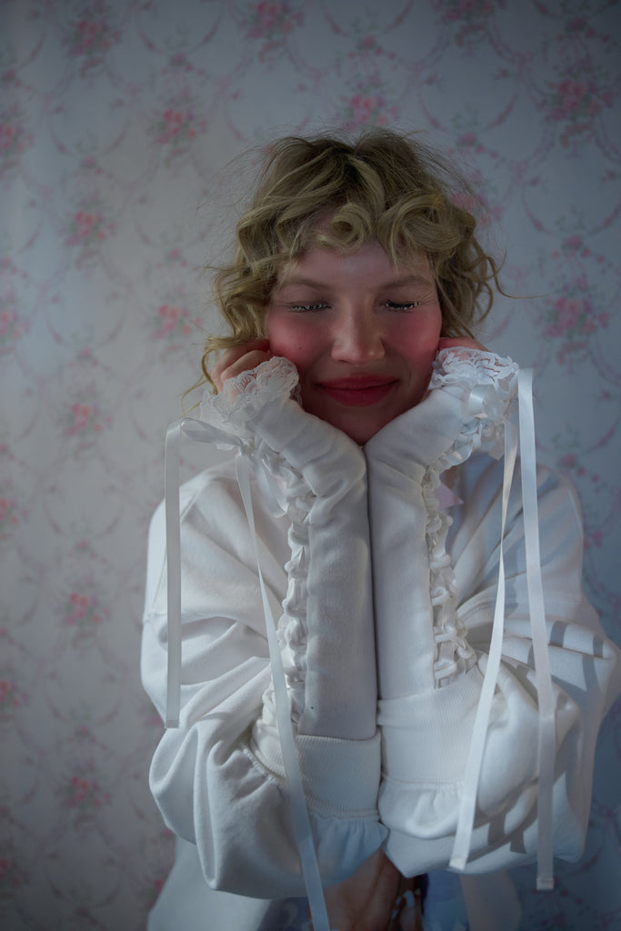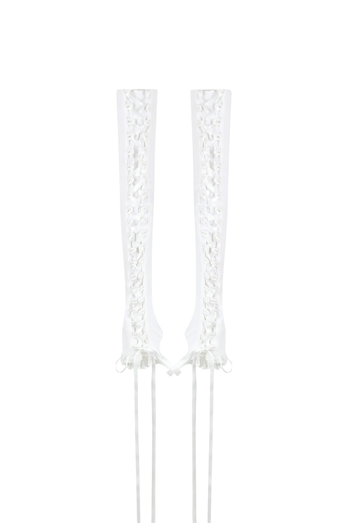 Selkie’s arm warmers arrive in super soft, cozy modal fleece in a white pure as snow. An elegant addition to any sleeveless top, dress, or gown, these are trimmed with lace, and a satin ribbon runs corset-like from the upper arm to the wrist, creating a striking silhouette.