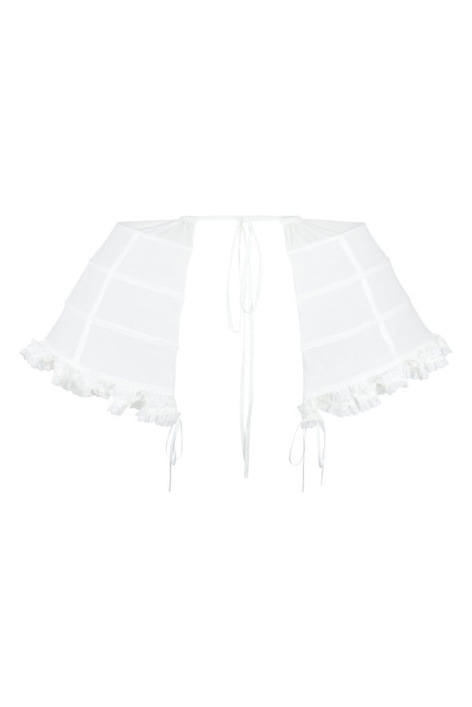 Transform any understated bridal gown into something extraordinary with this beautiful structured cage—the perfect way to take a simple dress and make it a little more spectacular. It ties easily at the waist with long ribbon and features a ribbon lace bottom ruffle with functional drawstring for perfect adjustability. This convertible piece can be worn or removed throughout your celebration, capturing the essence of old-world European romance while keeping everything effortlessly elegant.