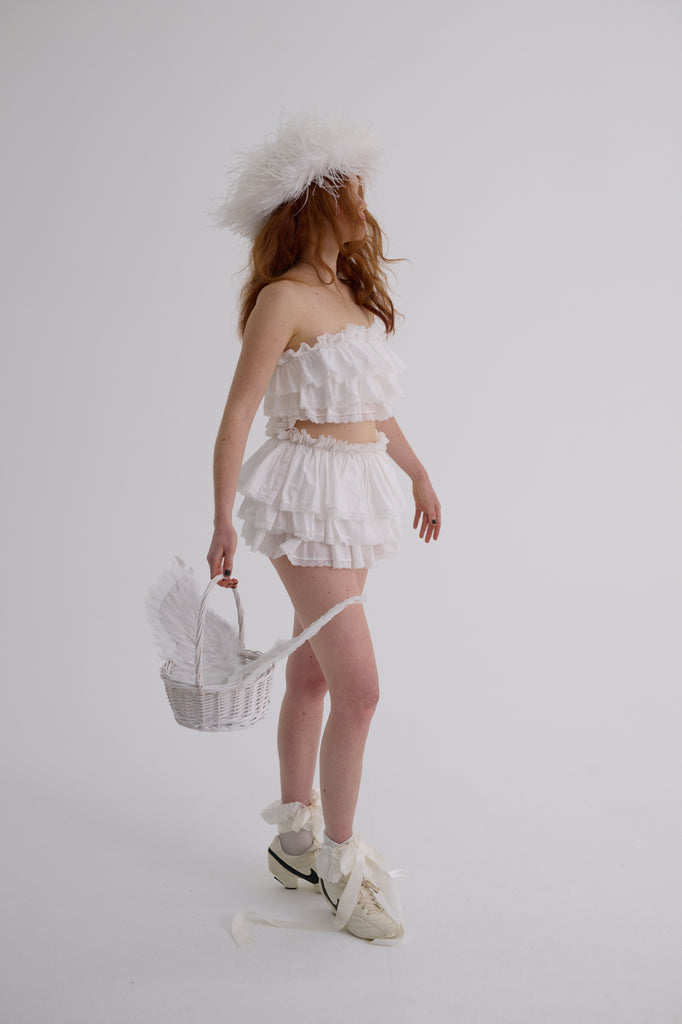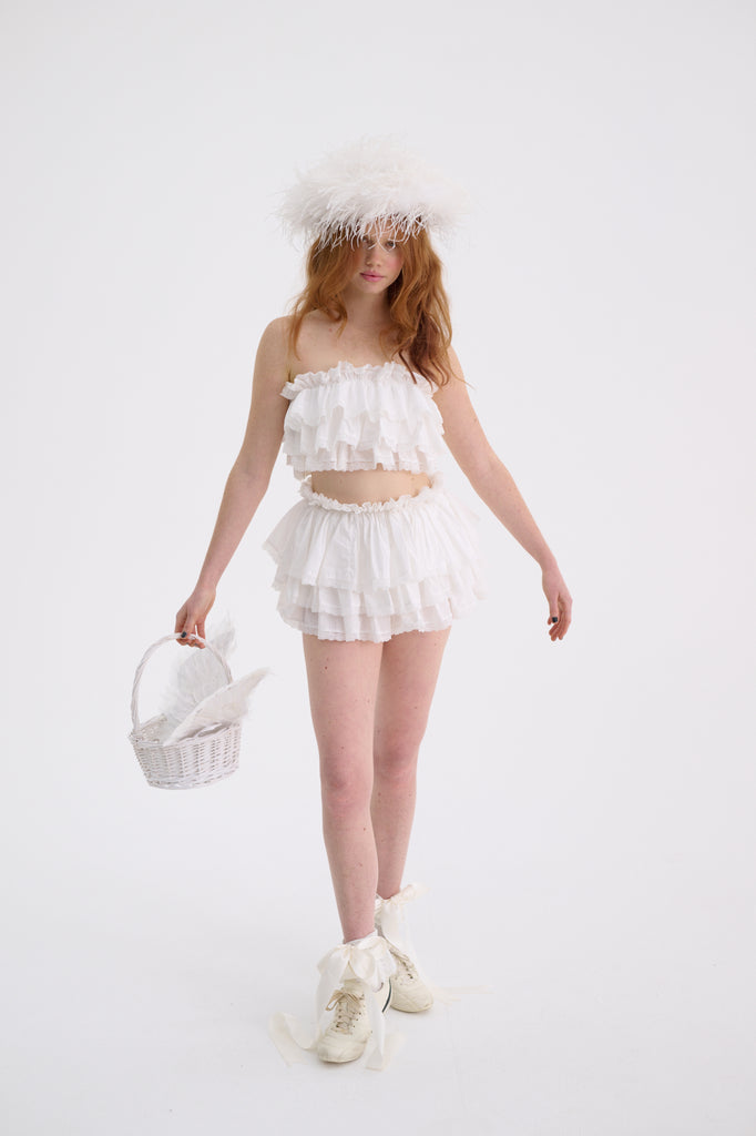You’ll be swept off your feet and transported back in time by these delicate, frilly knickers. Fall in love with three tiers of delightfully pleated cotton ruffles, evoking a vintage feel reminiscent of a can-can dancer or burlesque artist, whisking you into a romantic reverie. Featuring a sturdy, stretchy spandex panty underneath layers of paper cotton. Pair with the Ivory Dauphine Top to complete the look.