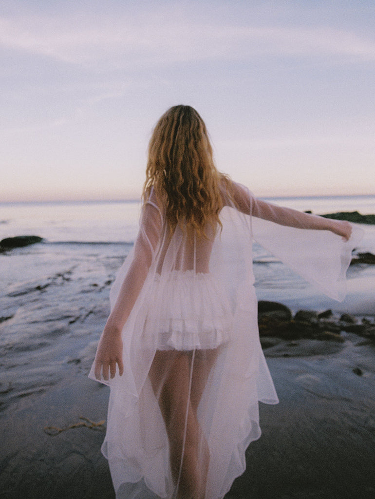 Amy is 5’9.5” and wearing a size XXS in Selkie. Her measurements are 30” bust, 23” waist, 34” hip.