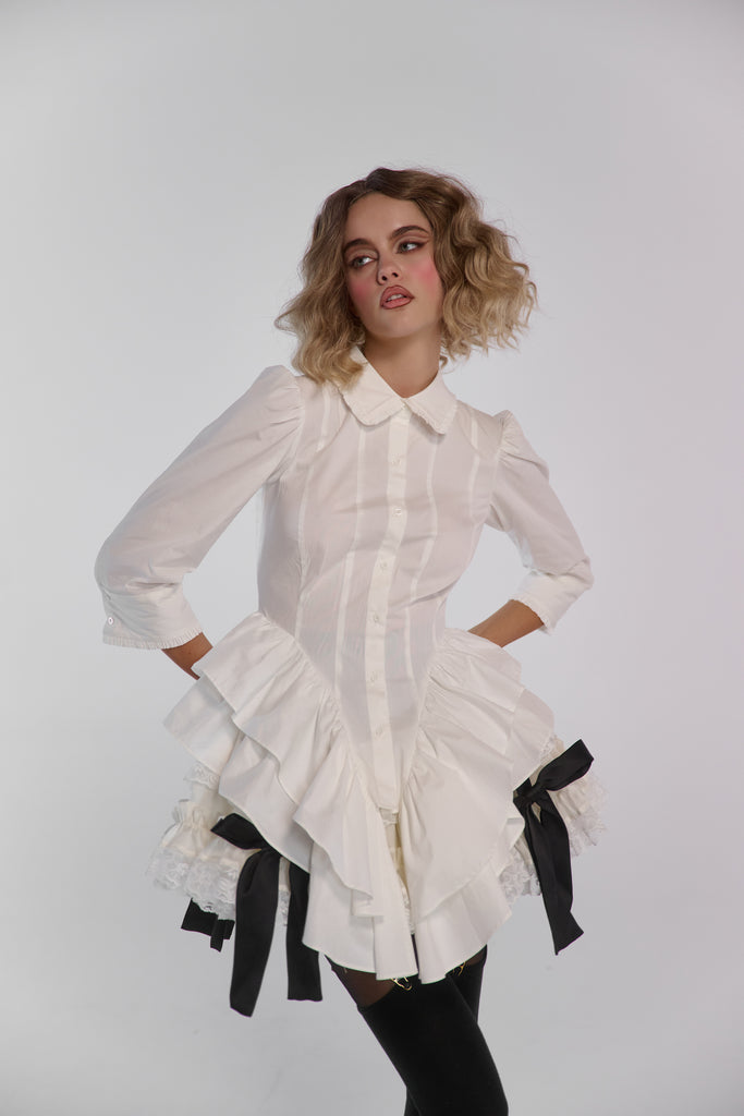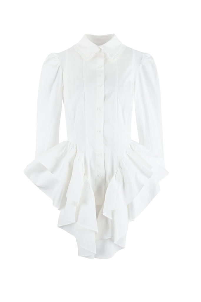 This cotton poplin blouse features a fitted bodice that flows into playfully tiered ruffles at the hip. Button-front styling and 3/4 sleeves offer refined structure. For the modern Gatsby girl who knows good clothes open many doors, from Zelli's to the Grand Hotel.