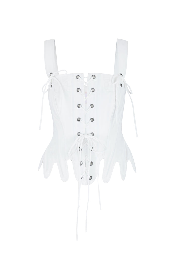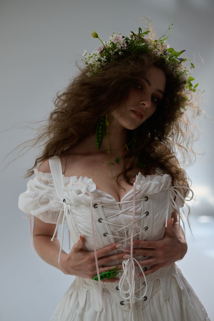 The Shipwrecked Corset evokes the haunting beauty of The Piano or Daughters of the Dust, with their salt air and Victorian-era elegance. This structured bodice features two draw cords for adjustable lacing and thoughtful tie straps. The distinctive jester-cut hemline adds Shakespearean flair to this late 18th-century inspired piece, while strategic boning and beautiful seam lines create an elegant silhouette. Whether worn pristine or slightly undone, you can wear this corset as if you were beginning anew on distant shores, simplifying life and finding beauty in what remains when everything else is washed away.