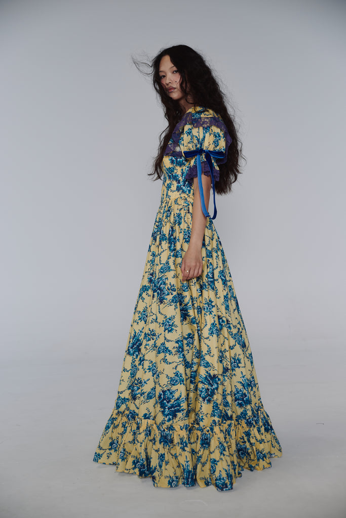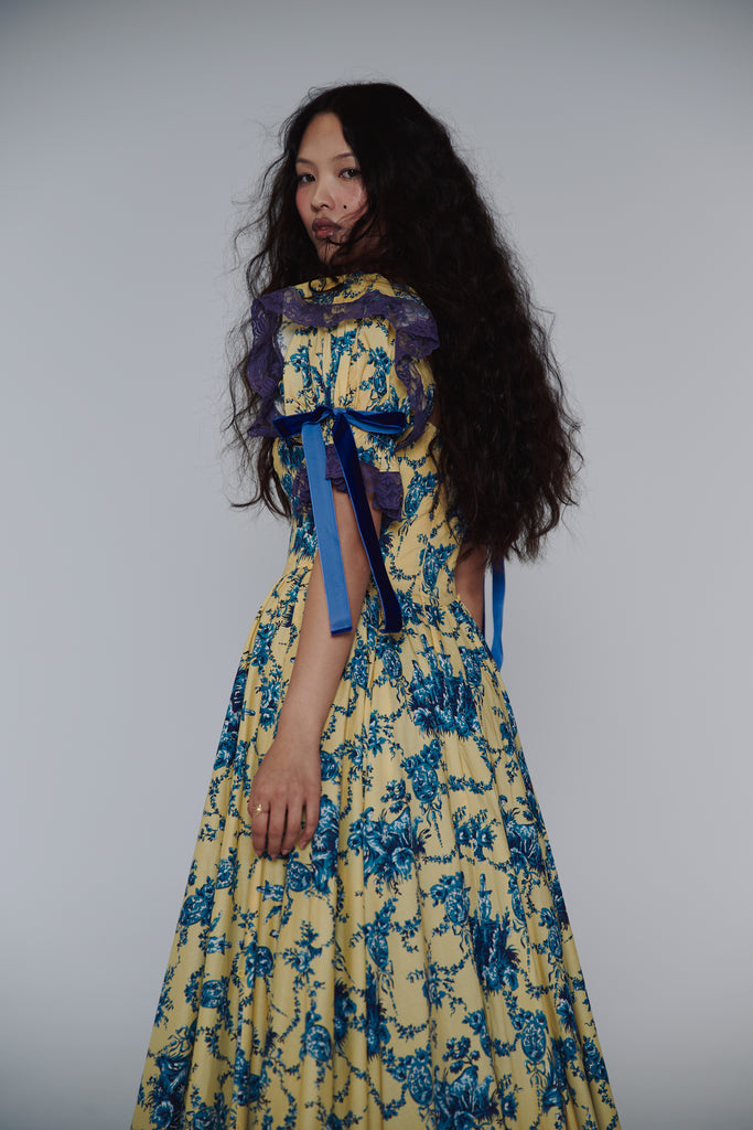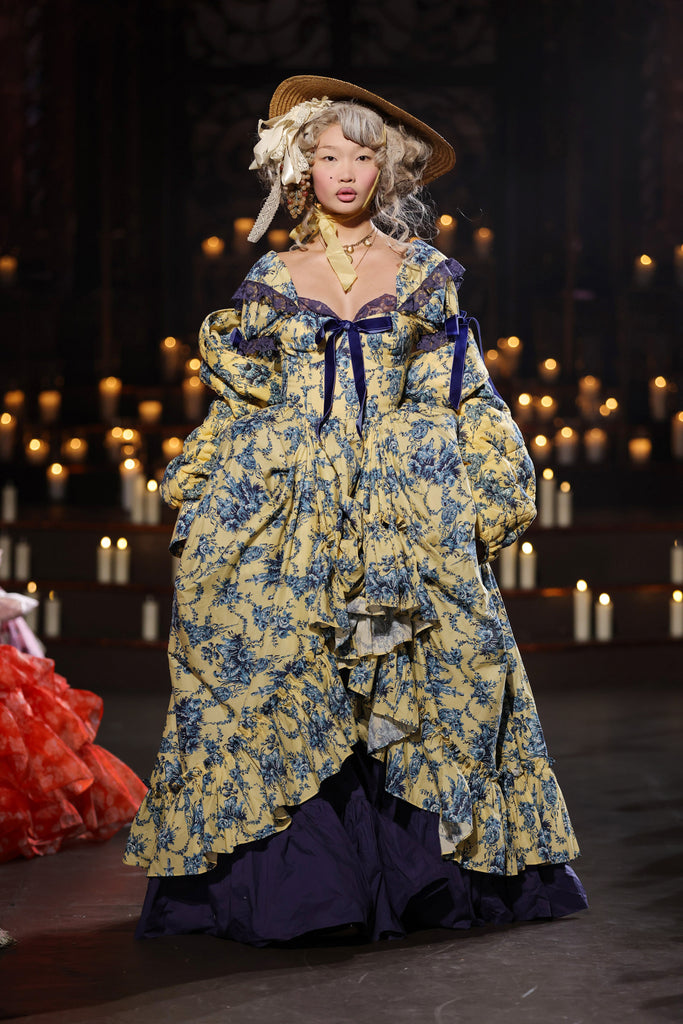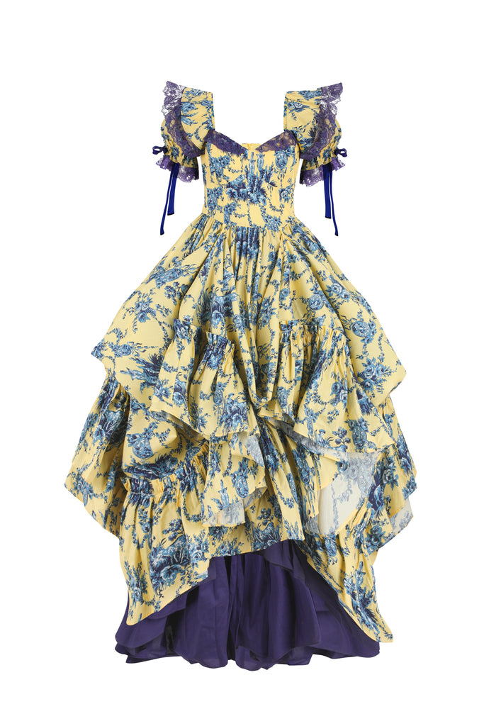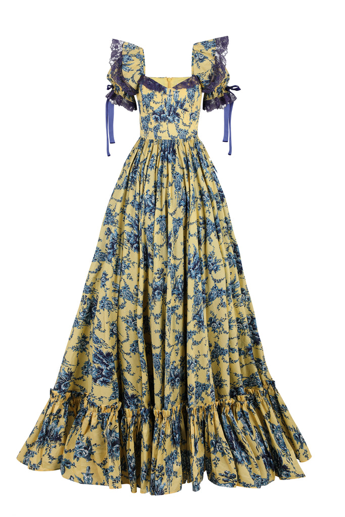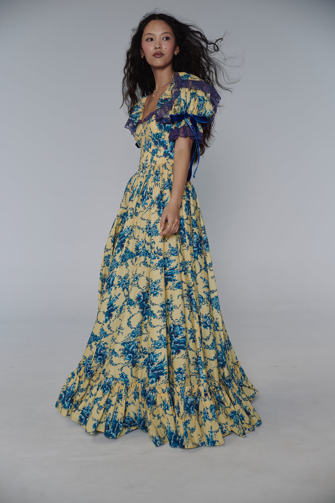 Reminiscent of delicate teacups come to life, this paper cotton gown transforms fine china artistry into wearable elegance. The Lumiere print embodies the French concept of "light" across flowing fabric, while full cups with underwire provide gentle support. Signature puff sleeves feature velvet bow details and contrast lace at bust and sleeves, creating textural beauty like hand-painted antique porcelain. A navy contrast petticoat adds depth beneath, while side bustles offer personalized fit.