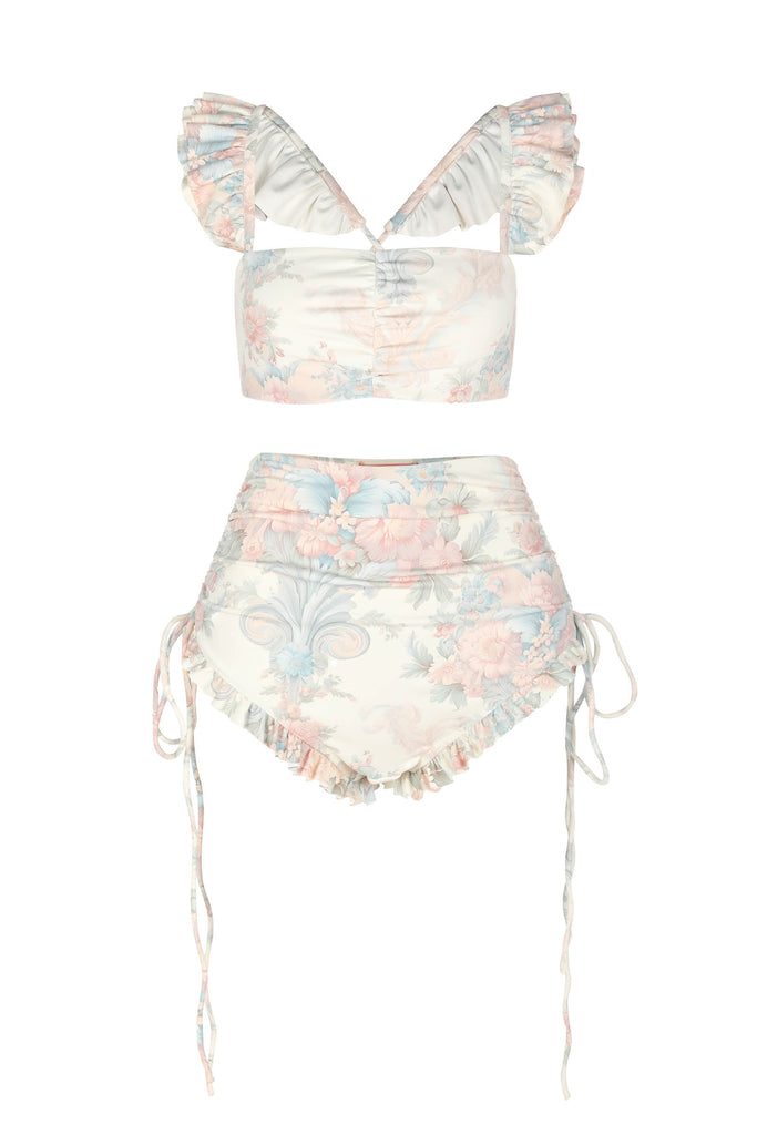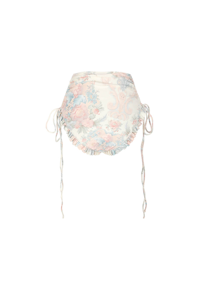 Designed for the avant-garde bombshell, these bikini bottoms combine the opulence of 18th century France with the gaudy flamboyance of the swinging sixties. Embellished with pastel-hued florals and filigrees in the sweet shades of French macarons, these bottoms feature a high-waisted, 1960s design and adjustable drawstring ties at the hip, while the pleated mini ruffle infuses a hint of rococo-inspired glitz.