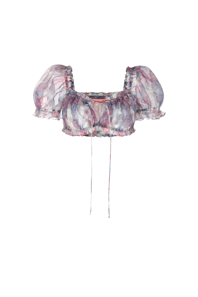Indulge in the playful extravagance of the 60s with the Macaron Beverly Hills Cover-Up, a sheer gauze cover-up that features charmingly puffed sleeves and a pleated bust, adorned with a tie at the centre. The Macaron print, which seamlessly blends rococo opulence with the era's delightfully gaudy aesthetic, creates a look that's both sugary sweet and sophisticated.