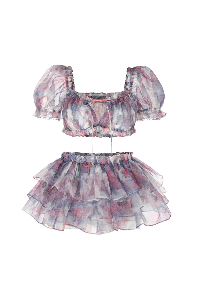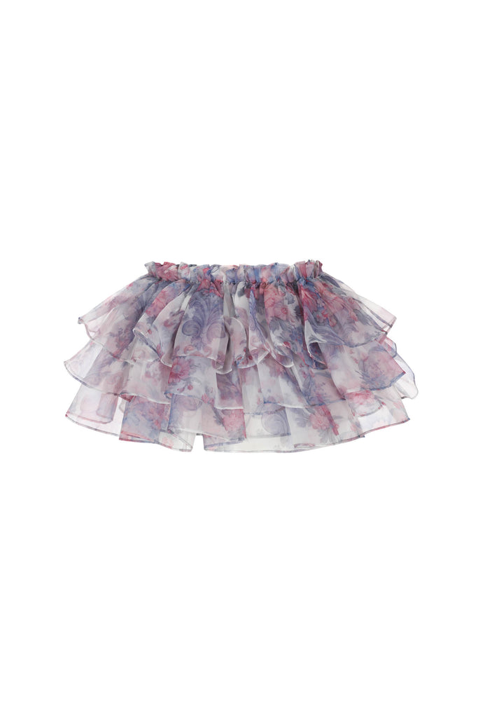 Exude the confidence of a dazzling 60s socialite in The Macaron Dauphine Cover-Up Skirt, a sheer gauze, over-the-top celebration of feminine mystique. In the Macaron print, a pastel-hued love affair between Kitschy eccentricity and rococo grandeur,, this tiered ruffle mini skirt boasts a pleated, elastic waistband and a convenient pull-on style, destined to cause a stir.