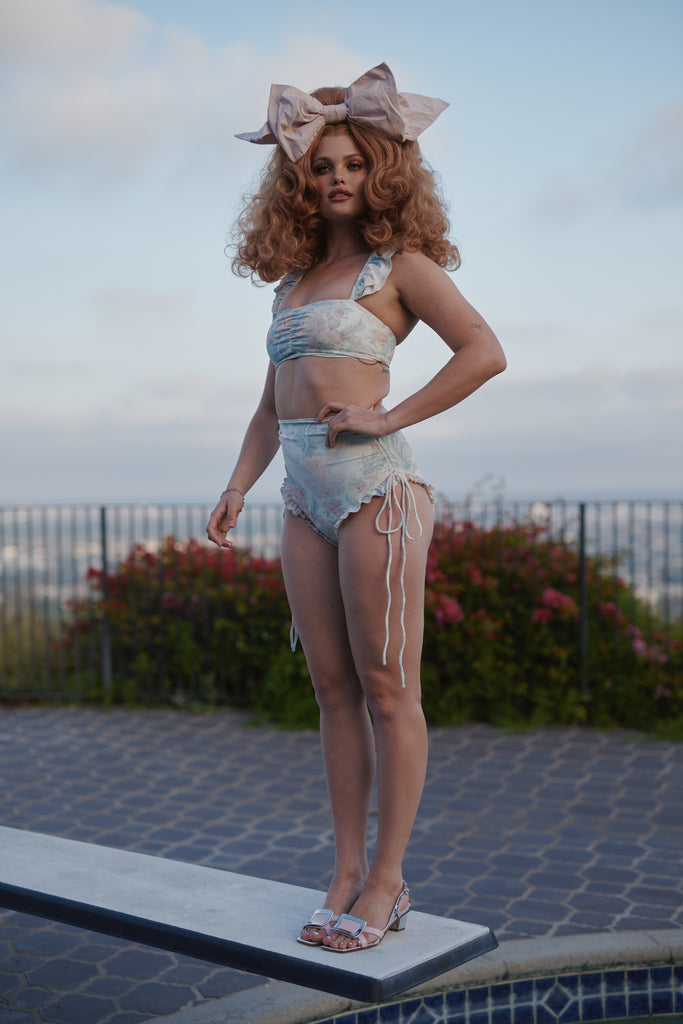 Selkie’s bikini debut is a nod to the classics, reminiscent of the iconic bikinis worn by bathing beauties of yesteryear, this suit is crafted in a classic spandex fabric. Featuring ruffle straps and a gathered bust, this top is ideal for a 60s dame, the Macaron print blending the grandiosity of 18th-century style with the playful audacity of swinging sixties.