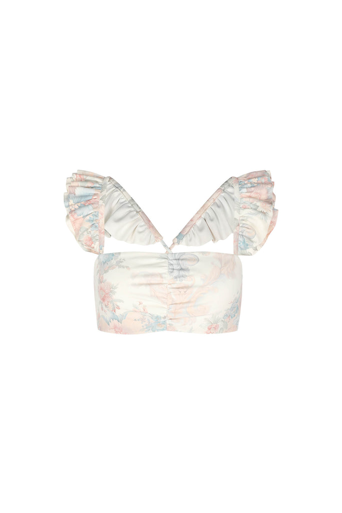 Bandeau swimsuit top with ruffle straps and gathered bust