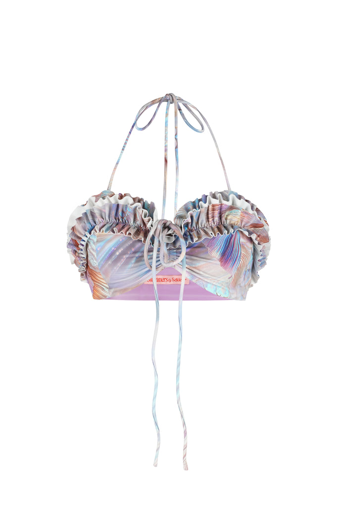 Make a splash with The Mermaid Cherry on Top Bikini Top, an enchanting tribute to the mystical siren for a true nature girl. This spandex bandeau top features iridescence that shimmers like real scales and fins while the whipped cream ruffle top transforms you into Neptune’s most beloved treasure.